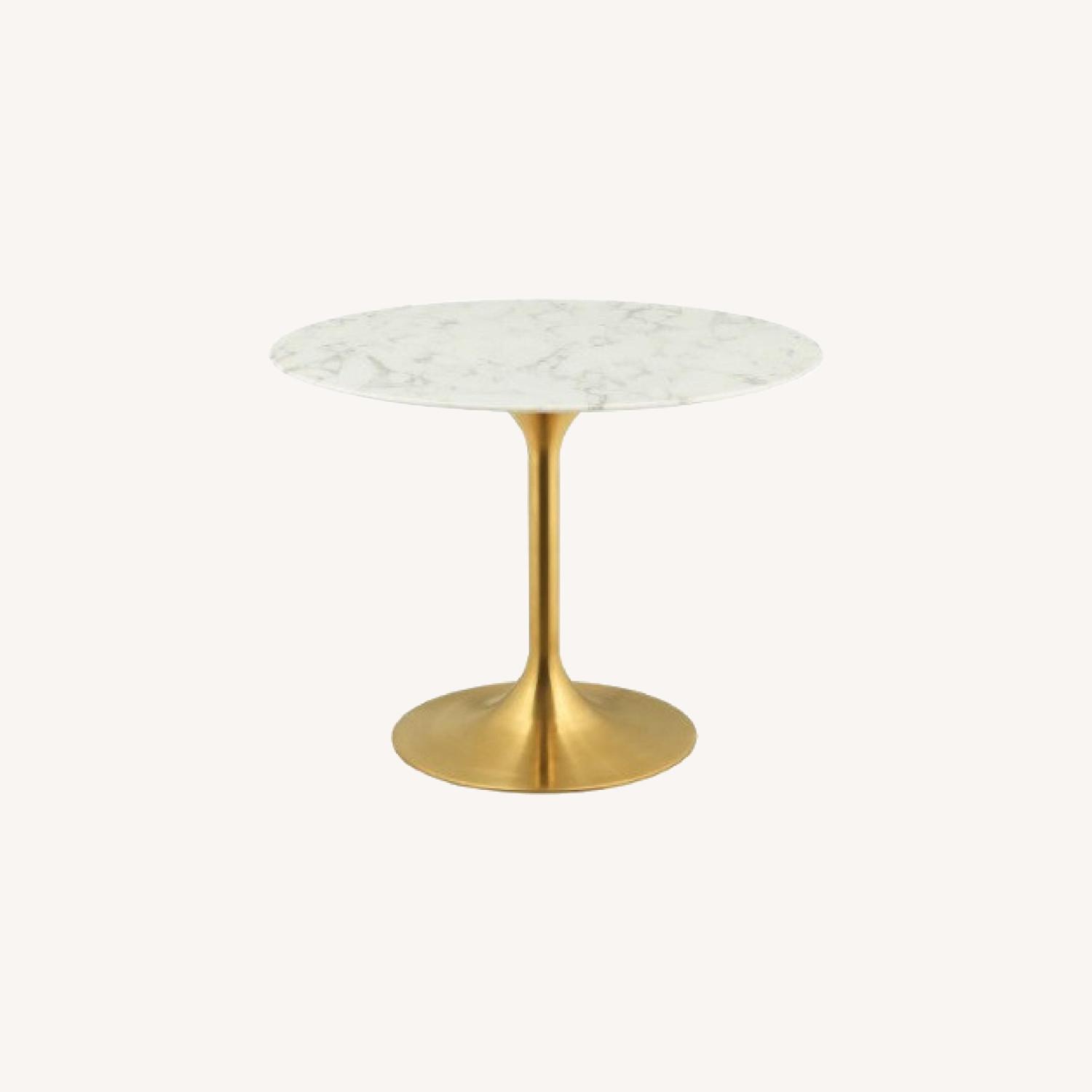 Seller's Notes:Modern and timeless tulip 40" table with white Marble top and gold/brass base. It was purchased in 2019 and is in good condition. It only has very faint (almost invisible) glue stains on the table top (picture 3 and 4) and very faint scratches that are only visible upon close inspection. It also has couple usage dents/scratches at the bottom of the base (picture 5 and 6) but nothing too evident.