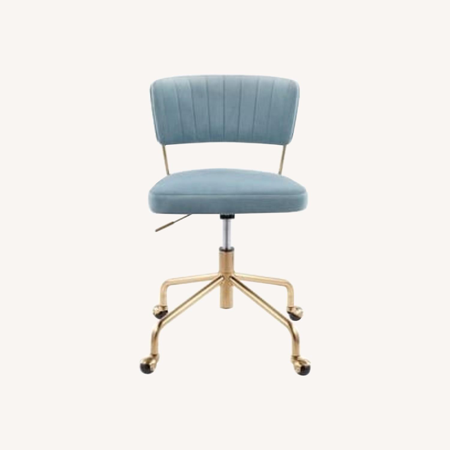 Seller's Notes:Stylish office chair that I used for a couple of years before moving. Now I'm re-doing my office and replacing with an office chair that matches my new color scheme. Condition is like new -- no blemishes. Turquoise-colored velvet cushioning, adjustable seat height, gold-colored legs, wheels. Looks great in shared office / living room space.