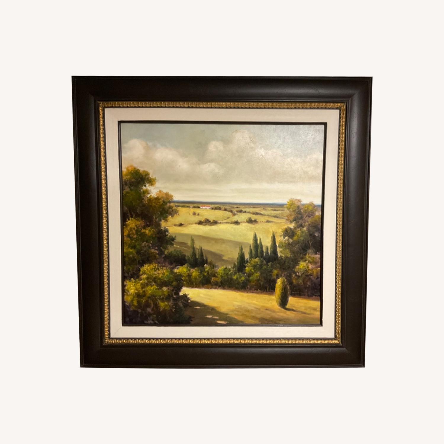 Seller's Notes:Love this painting of the Tuscan countryside, reminded me of our trip to Italy. Artist unknown. Large scale with frame, 51 x 51 inches. Beautiful black frame with gold accents.