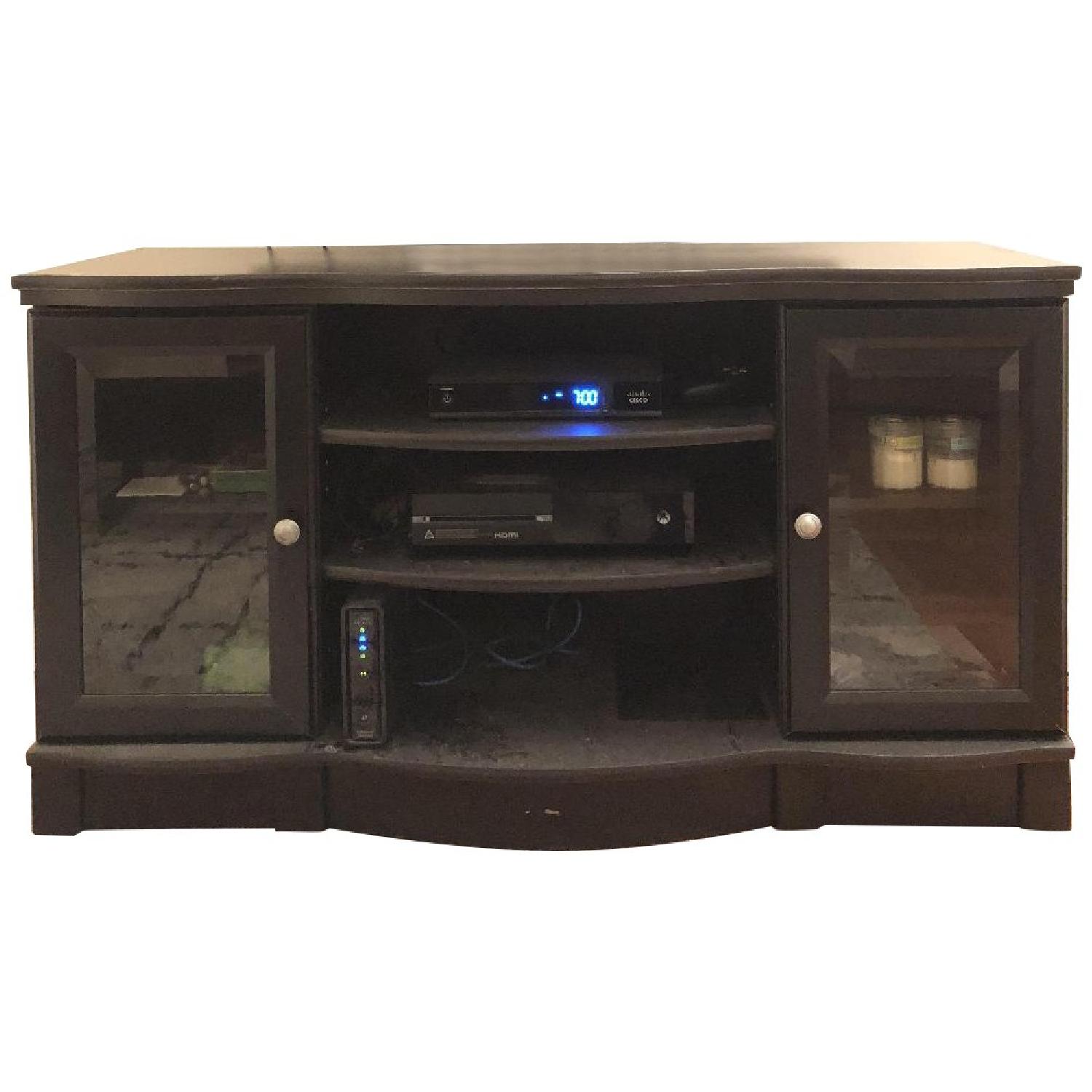 Seller's Notes:Great wooden TV and media display unit. Ample storage for all media and décor with both open and enclosed storage shelves (7 total compartments). Black color, glass doors, and size makes it a good fit for any living room or bedroom.