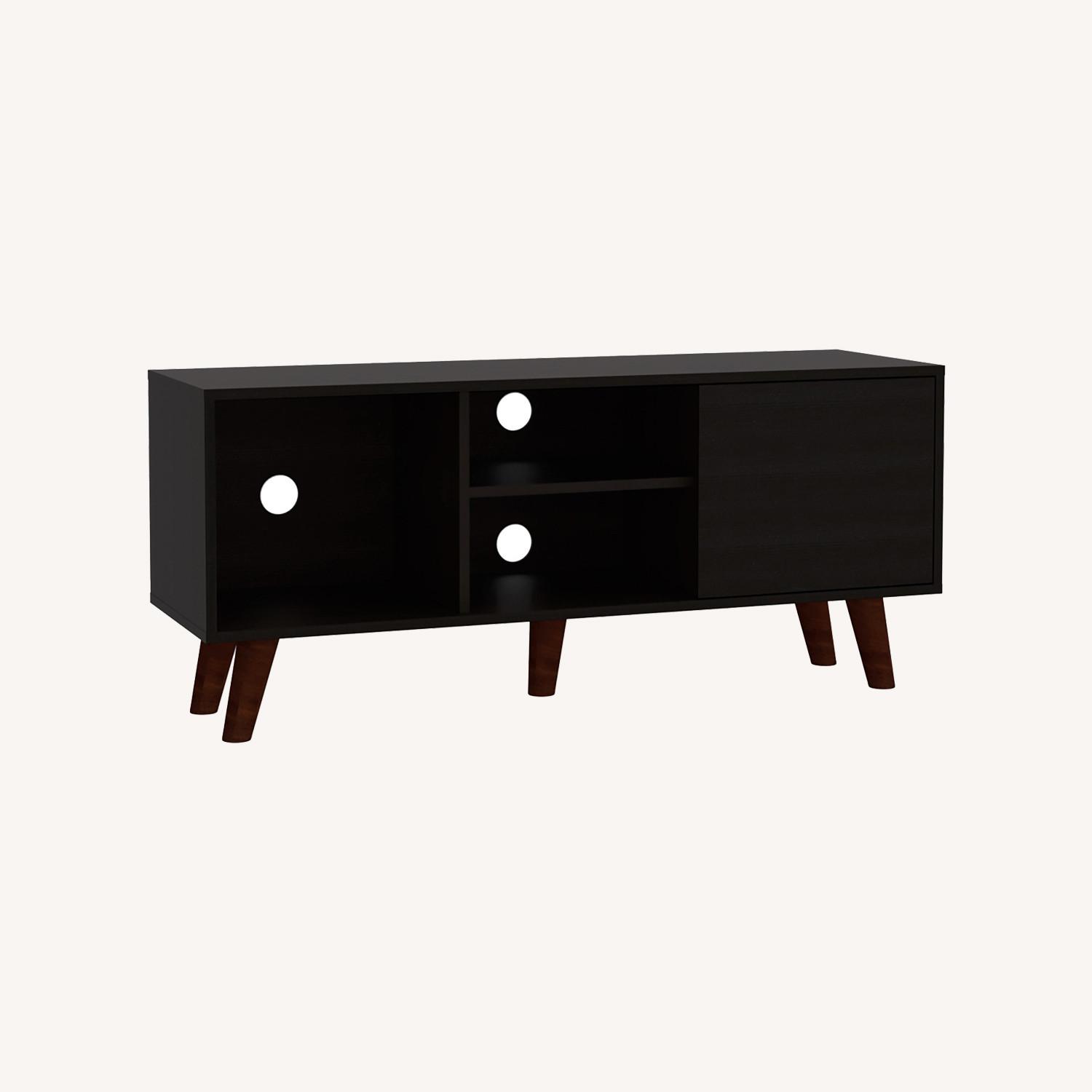 Seller's Notes:"Moon Tv Stand is a multifunctional piece of furniture that you can place in your living room or bedroom and make it look modern because of its design. It features a Tabletop where you can place a TV (maximum capacity of 50""), A spacious cabinet (14.1"" W x 13.7"" D x 12.5"" H), Two open shelves (Upper 14.5"" width X 13.7"" depth X 5.5"" height) (Lower 14.5"" width X 13.7"" depth X 6.49"" height), big open shelf (14.1"" width X 13.7"" depth X 12.5"" height). Designed with elegant Black manufactured wood finish. Dimensions: Height: 19,69” Width: 45,28” Depth: 13,78” Furniture Type: Ready to assemble (full assembly required). Certifications: CARB phase II compliant – TSCA Title VI Compliant. Warranty: 1-year warranty coverage in wooden parts- 1-year warranty coverage in hardware pieces since its manufacturing date found in the lot number printed in the product box. Shipment details: Free shipping to the 48 contiguous states - delivery time: Between 2 and 5 days depending on the customer's location, season, and weather factors. Other details: This product does not include decorative or background elements; Check that the box is in good condition, and well packed, and check with the help of the manual that the corresponding parts have been included; For more information regarding warranty, shipment details, cancellations, returns & replacement parts go to the bottom section of our website to learn more; Installation & Assembly Instructions included."