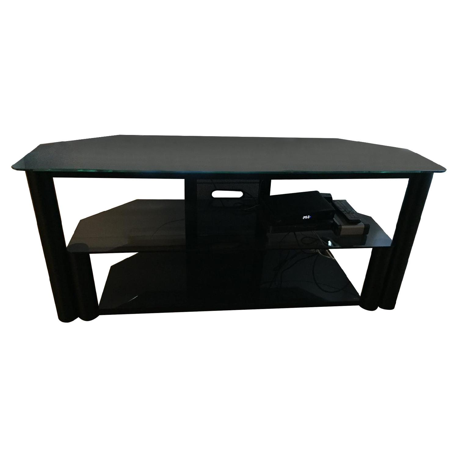 Seller's Notes:The TV stand has my 50' tv sitting very comfortably on it. It has two shelves below the level where the tv sits. It is glass with a black frame. The frame isn't metal but isn't plastic either.