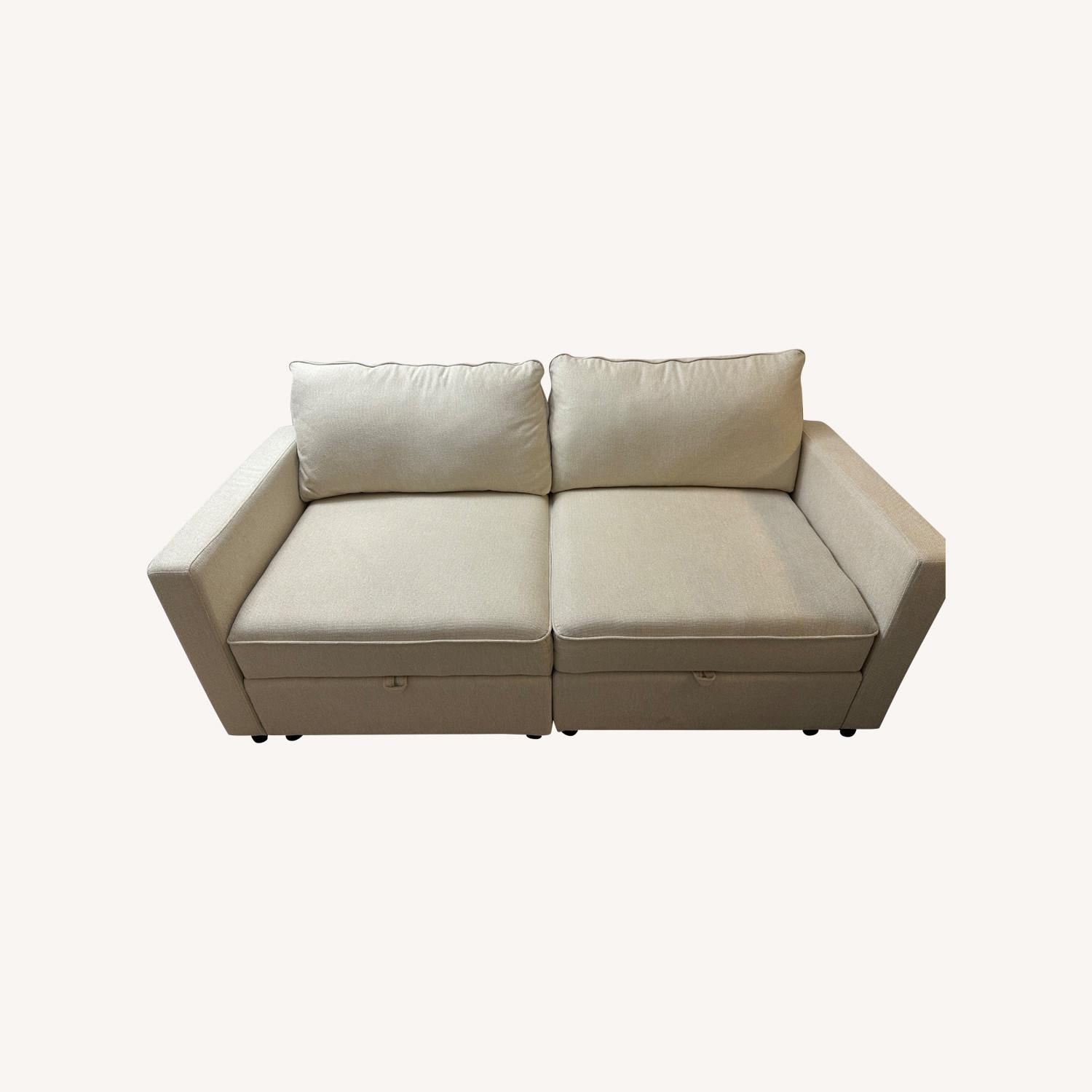 Seller's Notes:2 seat modular sofa with under seat storage in light beige. Measurements in pictures. Great for small or flex apartments. It’s in perfect condition, it was barely used all year. Easy to take apart into two pieces for transport as well.