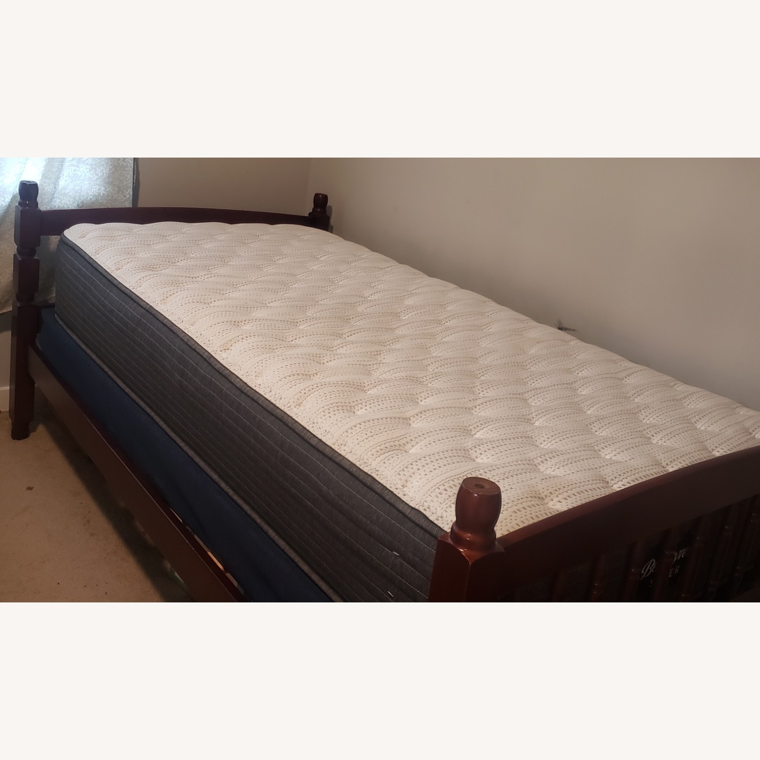Seller's Notes:One year old twin bed for sale. No pets, scratches and stains. Excellent condition. It comes with box spring and wooden frame.