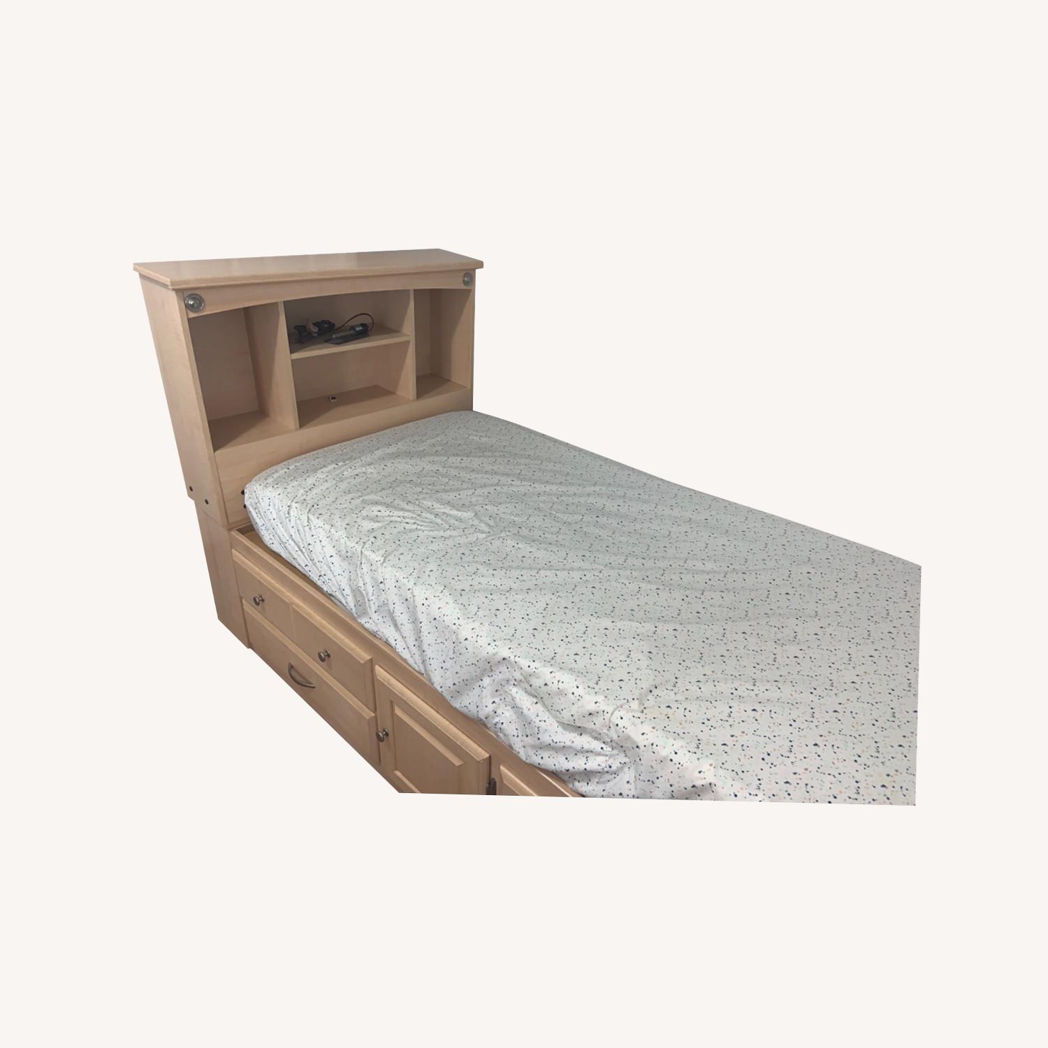 Seller's Notes:This twin bed is in great condition with minor scratches. The headboard piece can be detached for a daybed look. Headboard piece also has storage shelves and comes with a night light.