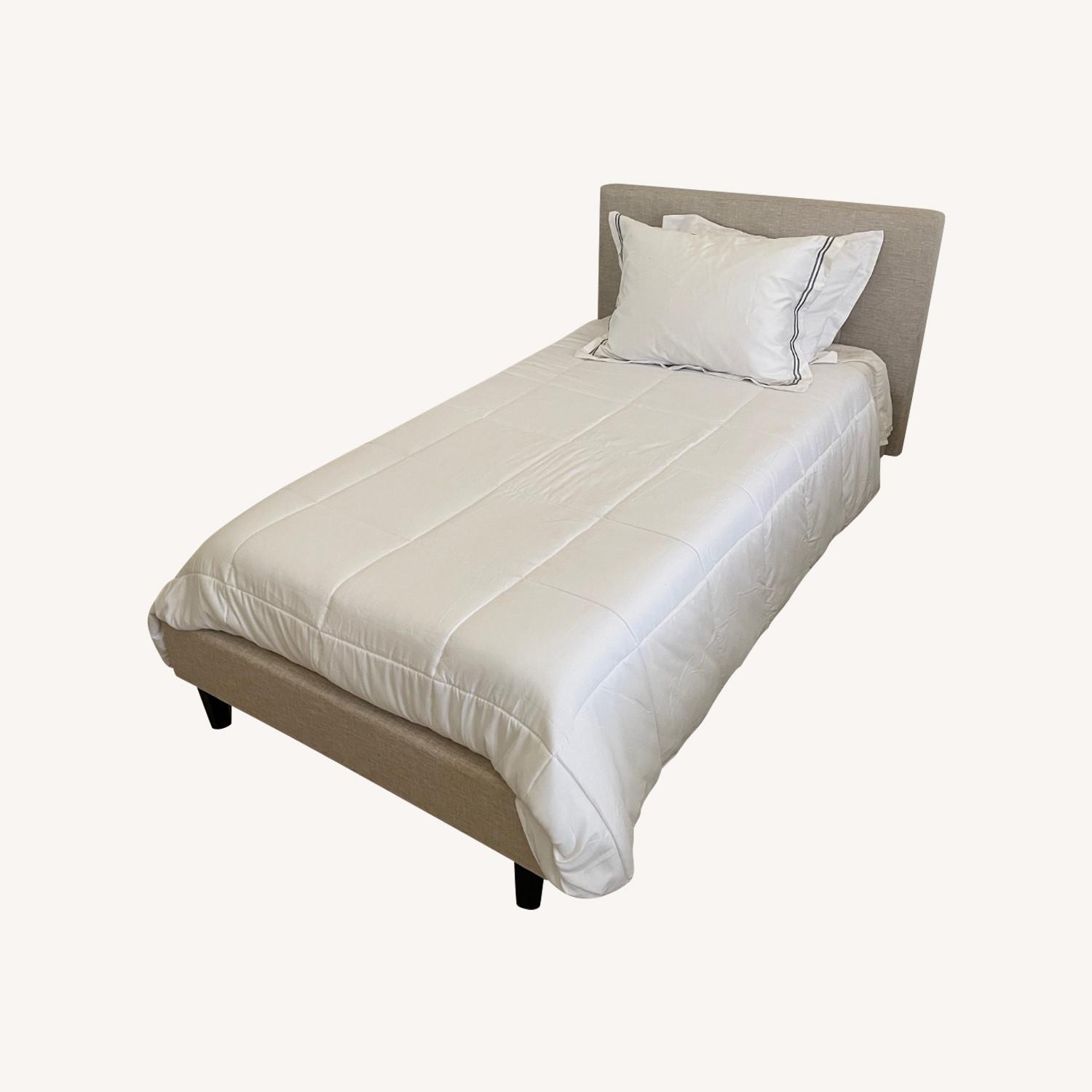 Seller's Notes:This set was in the second bedroom in case my mother needed someone to stay with her. This never happened, she has moved and no longer needs them. They were never used. Headboards are of linen material. New bedding included optional (duvets, pillows, sheets)