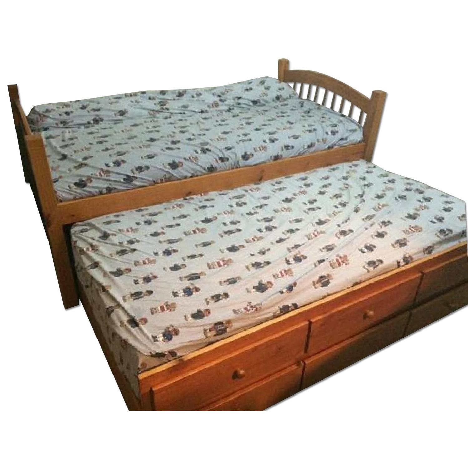 Seller's Notes:-Twin size, wood frame double bed (both beds are twin size and the second pulls out as the photo shows). -storage cabinets/drawers under second bed -Like New, no scratches or marks This bed is like new, barely used. Trying to get rid of it due to lack of space in apartment and no longer needed. Was used a couple times due to a family member who visited.