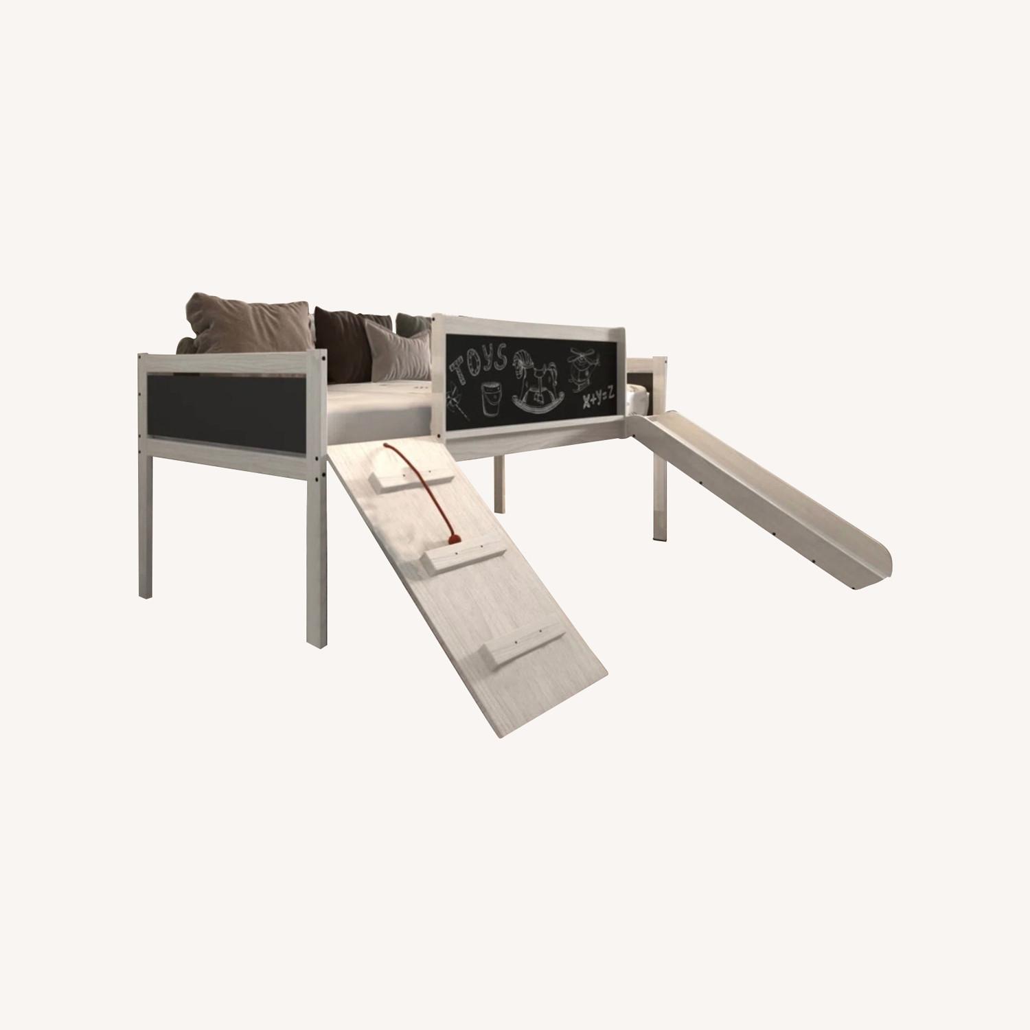 Get the most out of your purchase with the Donco Twin Low Loft bed. This bed is perfect for saving space and super stylish for children of all ages. The attached slide adds an extra fun component for getting your little one out of bed in the morning! Crafted from 100% Pine wood with steel reinforcements it includes slat kits that alleviate the need for a box spring, it’s a great bed for resting but also for play as we design our beds with your children’s safety in mind. Add some modern flavor to their bedroom with our White Wash and Dark Grey colored finish (non toxic) they blend well against a light colored surface. This bed’s unique design not only creates more space for your child, but will also add fond memories of playtime and sleepovers with the fun chalkboard. All of our beds are CPSIA or CPSC compliant and also ASTM compliant.