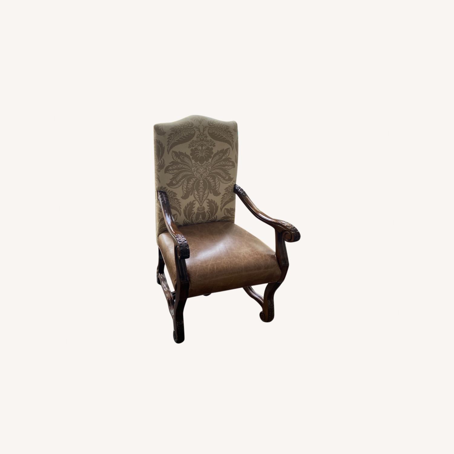 Seller's Notes:Tow upholstered back /leather seat armchairs. Can be used at a Dining table or on their own. In great shape with a little bit of distress on the arms and one of the chairs has Some discoloration on the leather seat.