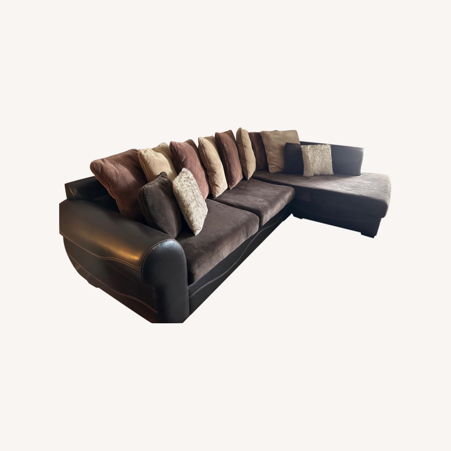 Seller's Notes:Brown two piece sectional sofa with chaise for sale. We have loved this couch - very comfortable and durable - however it does not fit into our new space. Approximate measurement is 123” wide with a cushion depth of 26” and chaise cushion depth of 62”. Smoke free home. Removable covers on bottom cushions for easy laundering. Faux leather base and arms. All pillows pictured included. Pick up required near Love Field.