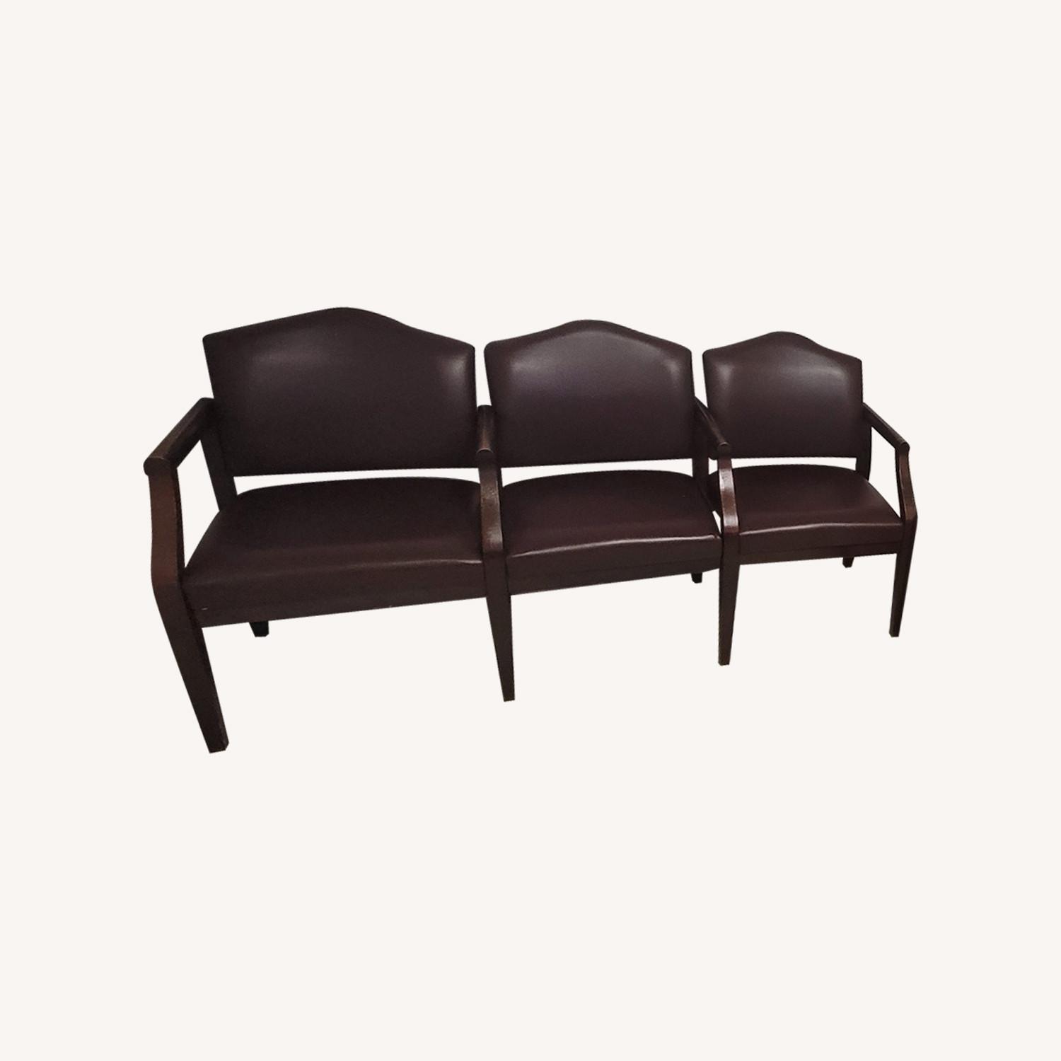 Seller's Notes:Two tandem chairs made of mahogany wood and a burgundy leather fabric for the seats. Each tandem chair can seat up to three people. These chairs are great for the office reception area.