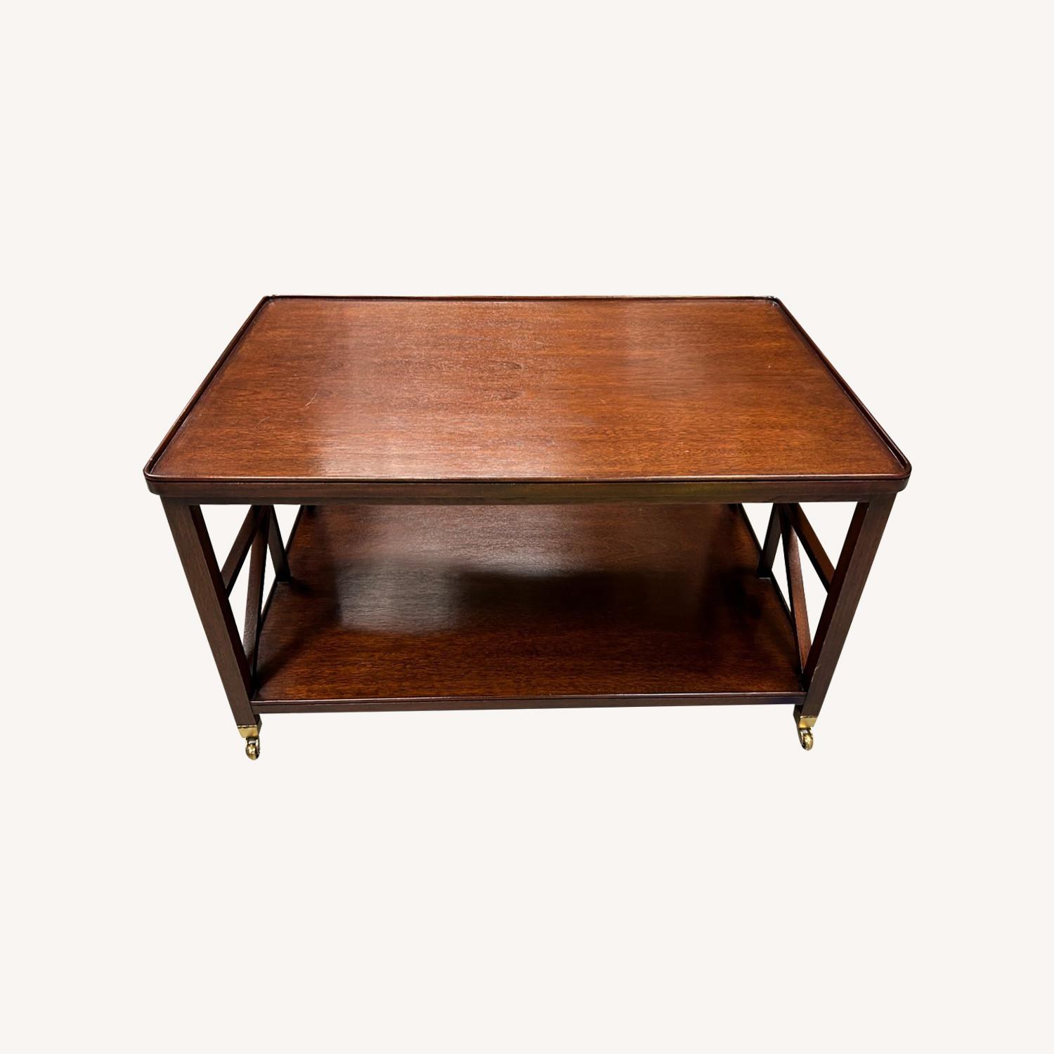 Seller's Notes:Two-tiered, dark brown coffee table with gold wheels. The table is in perfect condition with no blemishes. It has been re-stained and lacquered for maximum longevity.