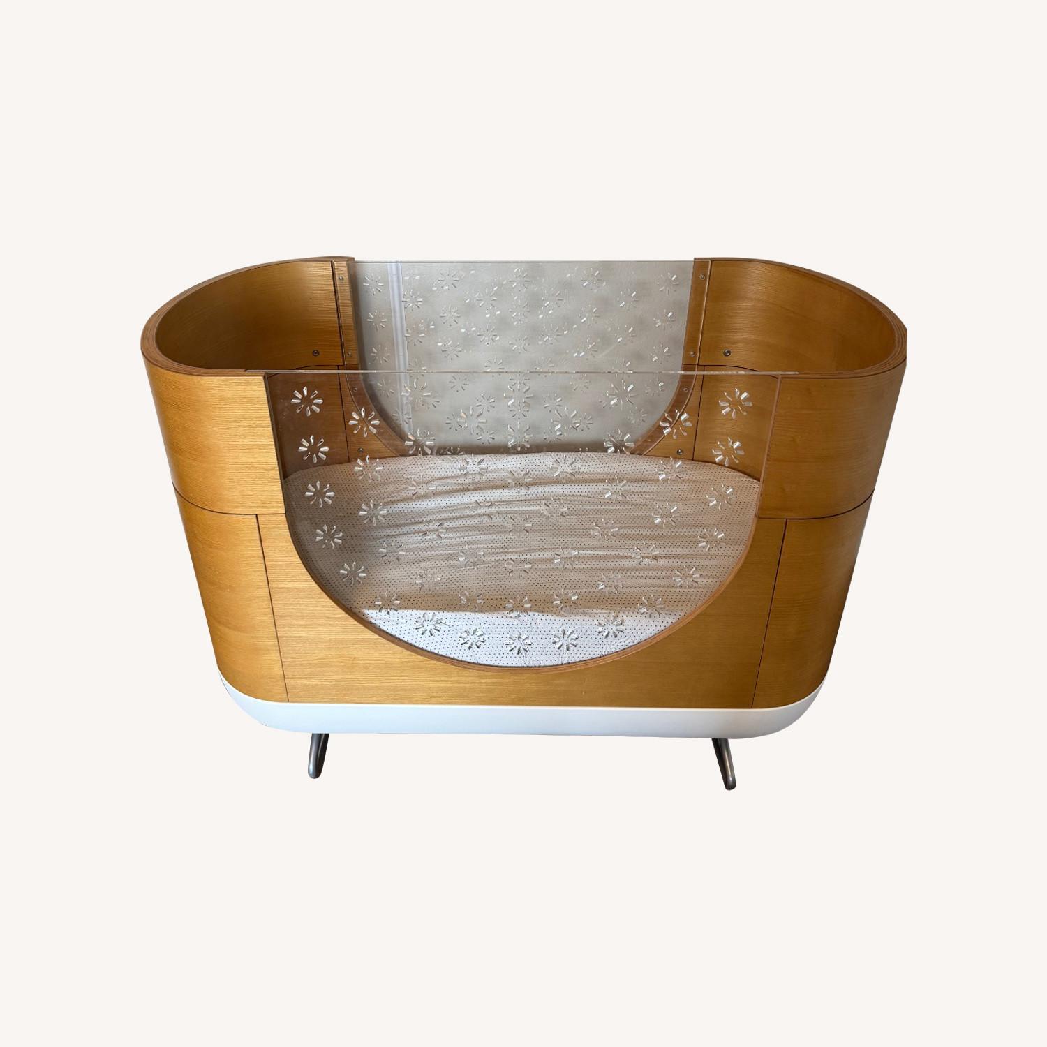 The Pod Crib is a cozy cocoon-shaped crib with smooth, rounded edges for a distinct modern look. Innovative clear acrylic sides allow for an unimpeded view inside the crib, making checking on baby simple. A series of carefully designed star shapes have been laser-cut out of the sides to provide additional airflow, while still being small enough to keep little fingers safe. The Pod Crib is easy to assemble, clean and maintain, and includes a custom-fitted mattress, junior bed conversion kit and features two adjustable mattress positions.