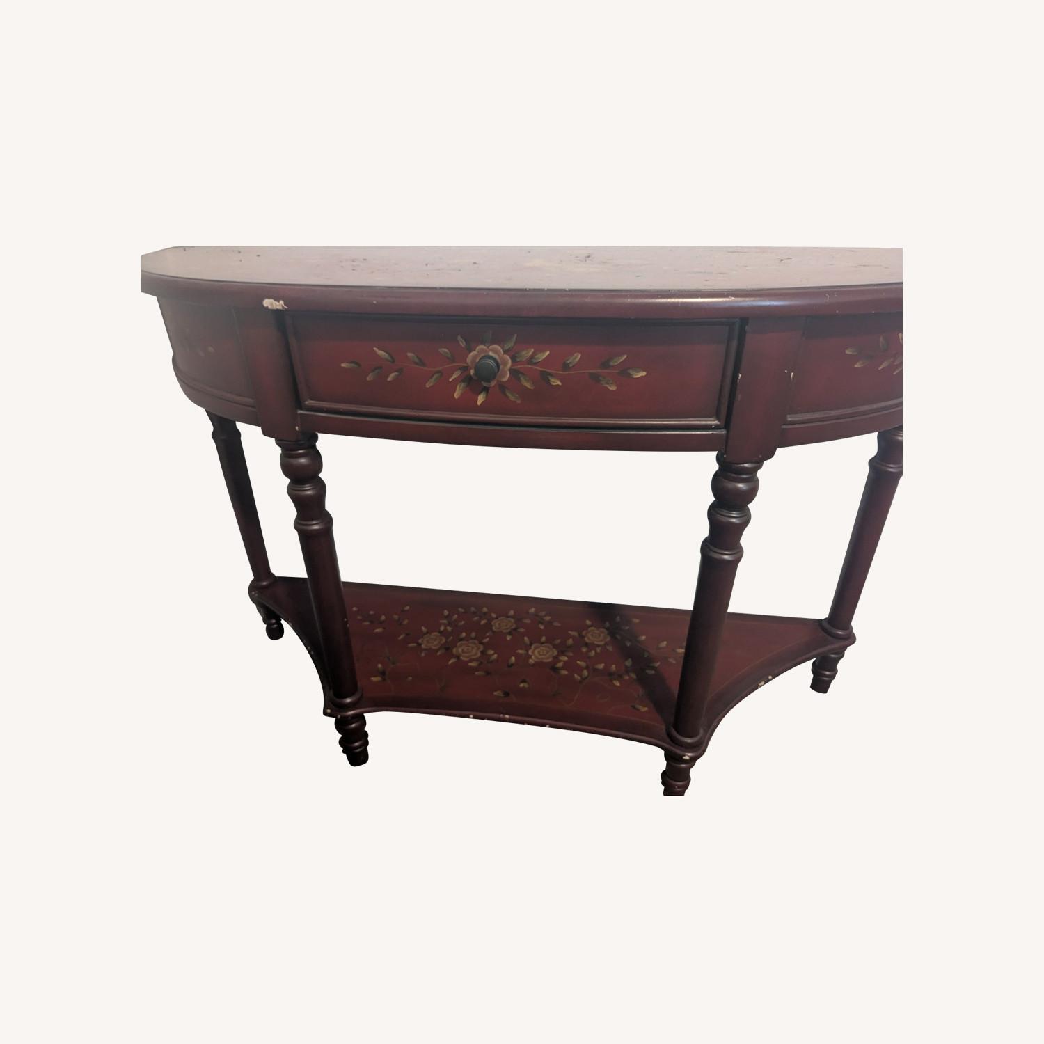 Seller's Notes:This beloved side table was used as a make-shift vanity. The floral pattern is so unique, featured on the top surface and the bottom shelf as well. The table has decent storage space in the drawer as well. There are a few scratches but can probably be fixed and mitigated by someone with skill.