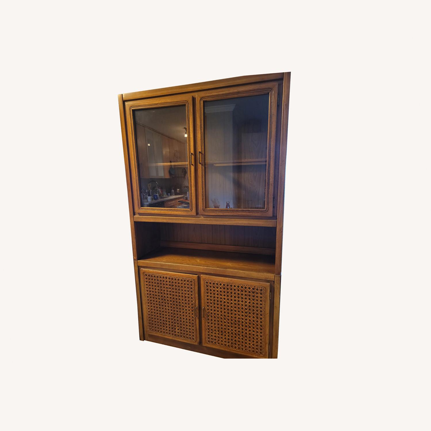 Seller's Notes:This wooden hutch/china cabinet is great for displaying dishes and knickknacks. It has an internal light at top, magnetic doors, internal shelves and a drawer, and comes apart into two pieces. Sturdy but relatively lightweight.