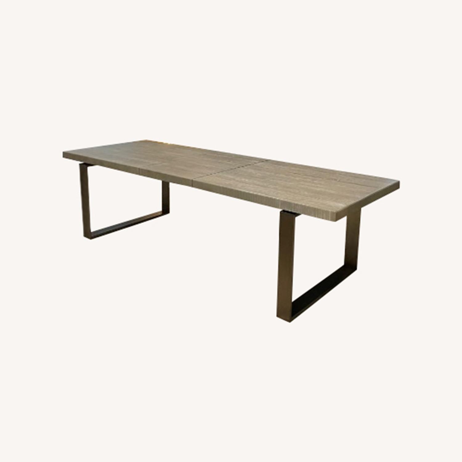 Seller's Notes:The Robards Rectangular Dining Table artfully juxtaposes a lustrous bronze base against a delicately ridged, matte-finished wood, creating a bold dining room statement piece. Table comes with extendable removable piece. PRODUCT DIMENSIONS 84W X 38D X 30H FINISH Quartz 6 Universal Onyx Dining Chairs (High Fashion Home), Beige seats and Bronze frame https://www.universalfurniture.com/item/robards-rectangular-dining-table-645 https://www.highfashionhome.com/products/robards-dining-table?variant=32445738123339&nbt=nb%3Aadwords%3Ag%3A19640244154%3A148495689489%3A646714469431&nb_adtype=pla&nb_kwd=&nb_ti=pla-474882865430&nb_mi=284531388&nb_pc=online&nb_pi=shopify_US_4602194296907_32445738123339&nb_ppi=474882865430&nb_placement=&nb_li_ms=&nb_lp_ms=&nb_fii=&nb_ap=&nb_mt=&tw_source=google&tw_adid=646714469431&tw_campaign=19640244154&gad_source=1&gad_campaignid=19640244154&gclid=Cj0KCQjwrPHABhCIARIsAFW2XBMaR43aKnIO8Q-CFoREYFmW3gAgvPAeOFBIyZaBzVaiH_zwufAqS9caAm74EALw_wcB