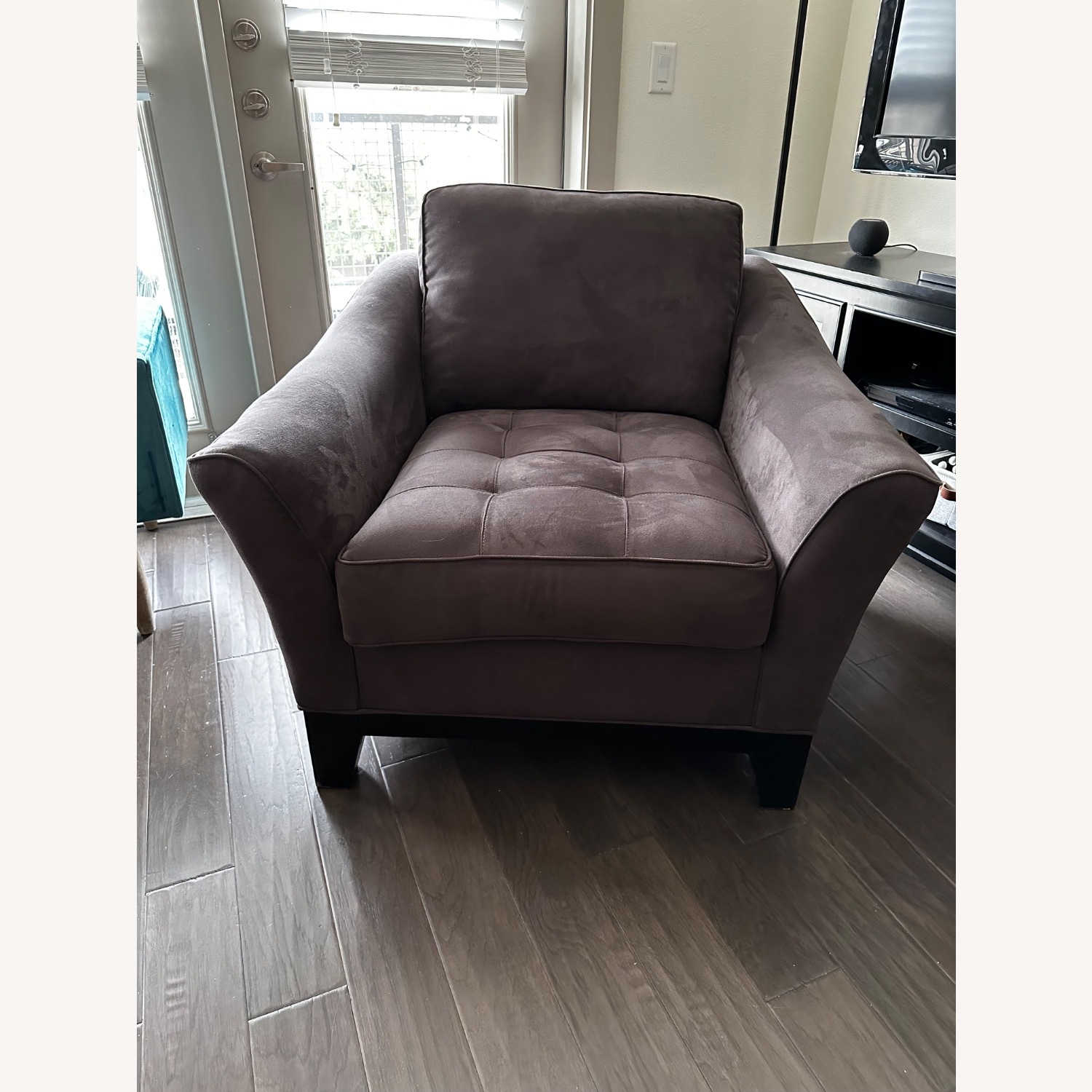 Seller's Notes:Comfortable upholstered accent chair in a neutral gray fabric with a tufted seat and supportive curved arms. Works well as a living room chair, bedroom chair, or or reading nook piece. In good overall condition with a couple of scratches on the legs. Very lightly used.