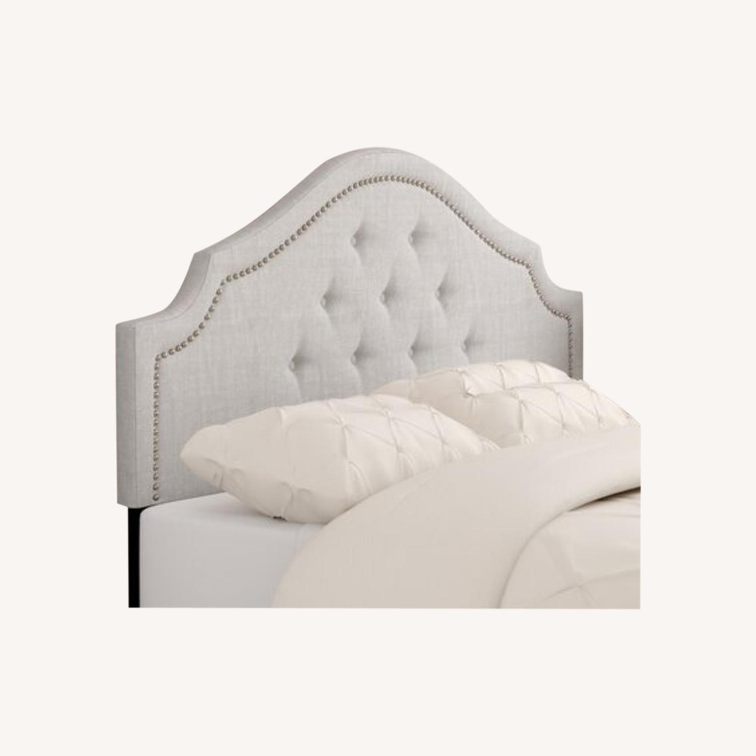 Seller's Notes:Lavinia upholstered Queen Bed Platform Frame. Light gray with silver accents. Dark gray image is to show show platform with slats.