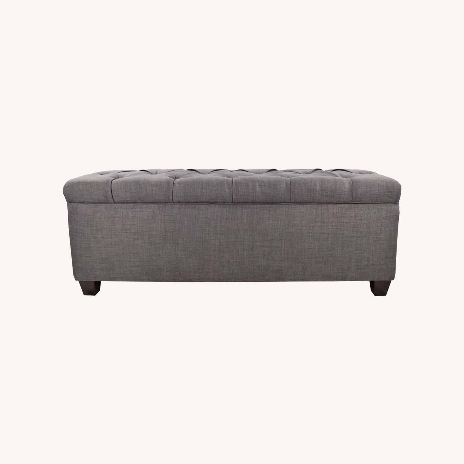 Seller's Notes:Gray upholstered storage bench with 18 compartments, perfect for organizing shoes, accessories, or other small household items. The tufted, padded lid offers comfortable seating, while gas-lift hinges make it easy to open and close. Ideal for entryways, bedrooms, or closets.
