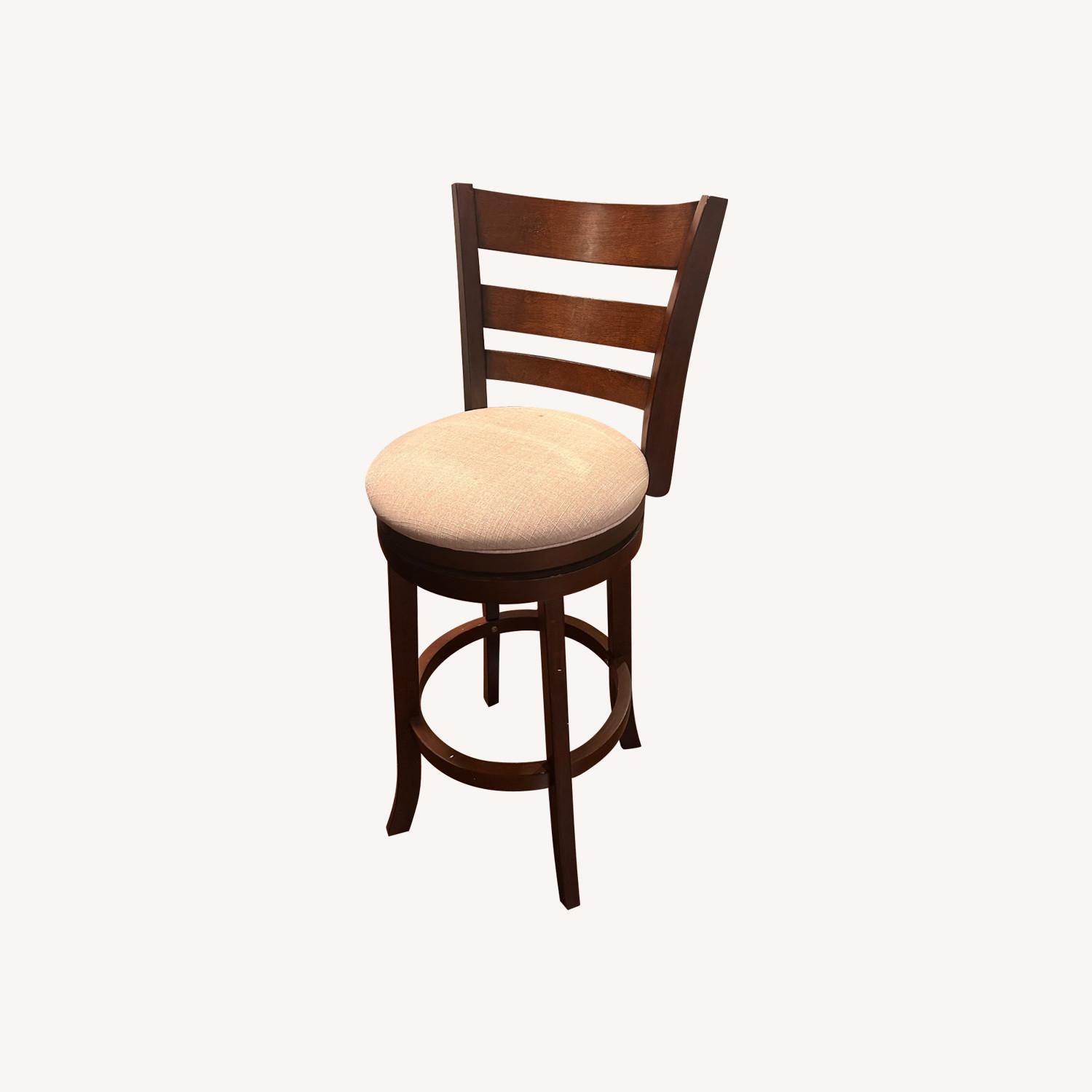Seller's Notes:This swiveling bar and counter stool add the finishing touch to your kitchen island with a sleek, traditional look. It's crafted from solid wood, bringing warmth to your room's color scheme. The design features four legs with subtle flaring, a round seat, and a full back with a ladder construction that feels both classic and breezy. We love that the seat is wrapped in linen upholstery, and filled with foam for comfort and support. Plus, the built-in ring footrest and swiveling function make it easy to relax on this stool.