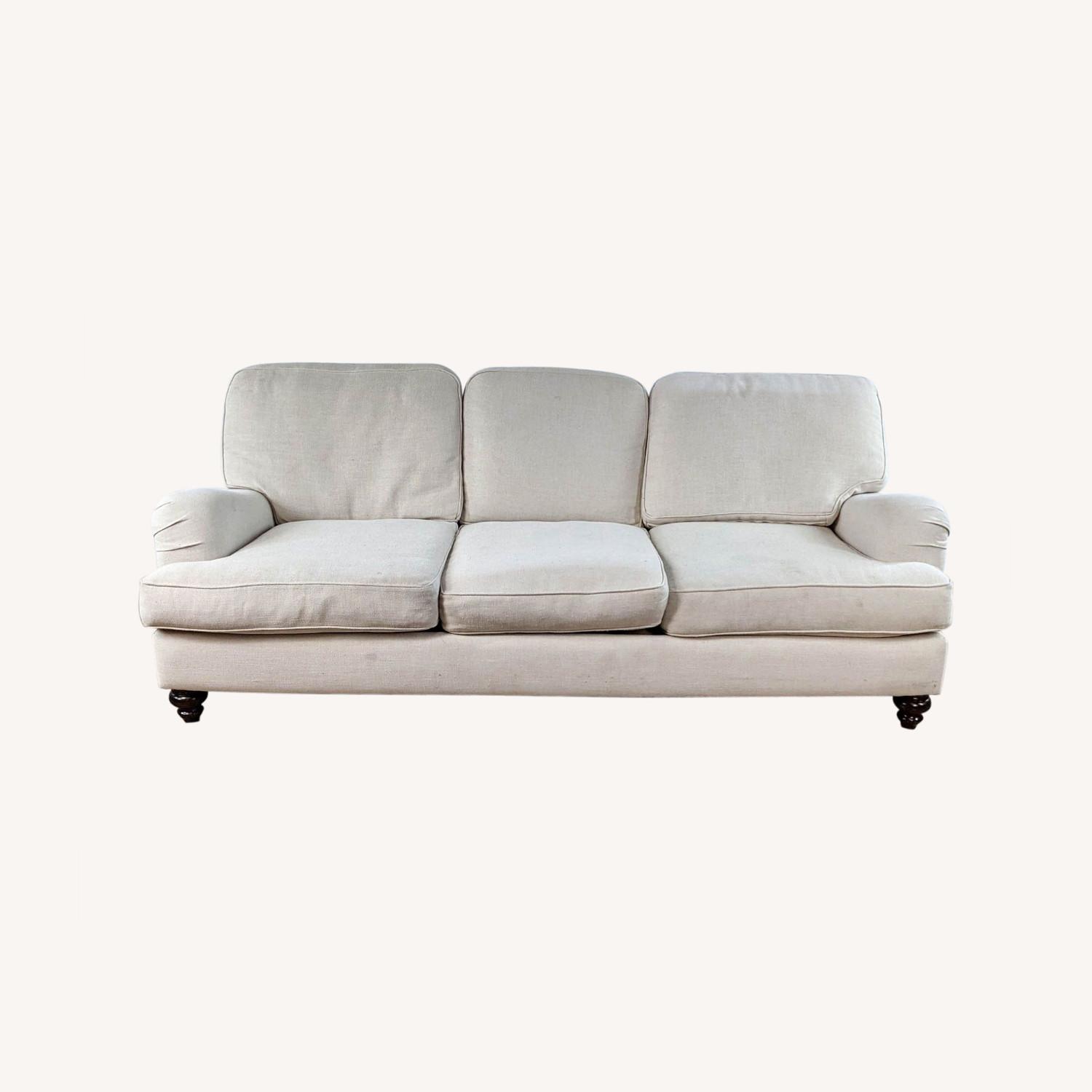 Seller's Notes:Linen Look Fabric Upholstered Ivory Sofa With Saddle Arms And Spindle Legs. Brand: Living Space. Model: . #SKU: 1049388