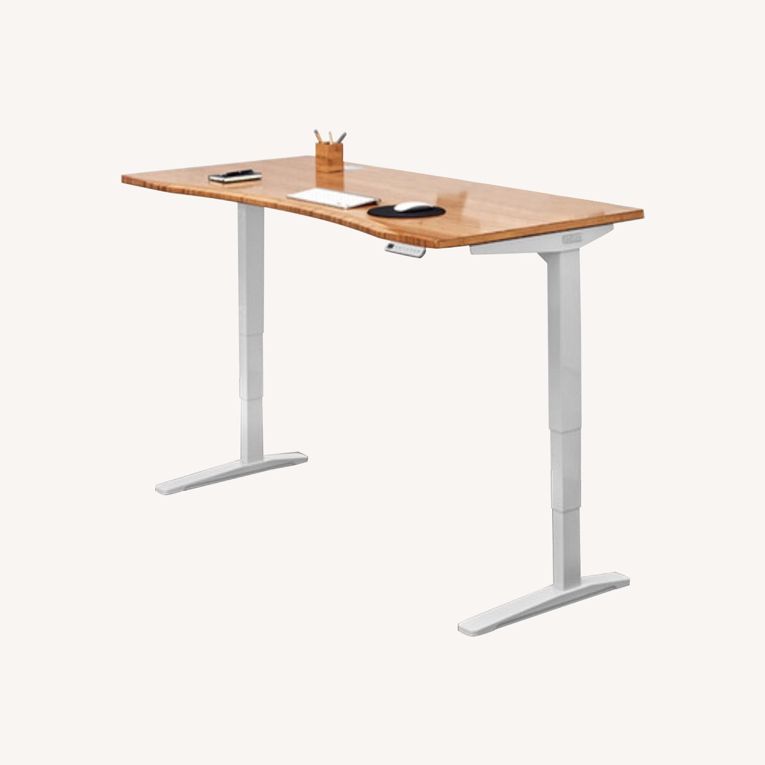 Seller's Notes:60" Bamboo Ergo-Edge Curve top * Eco-friendly desktop is constructed out of sustainable and carbonized Bamboo. * Motor hidden inside legs. * Lifts up to 355lbs. * UV-cured using an eco-friendly process with no VOCs or air pollutants * Cable management channel and power outlet mounted underneath. * Can be adjusted to 48” tall
