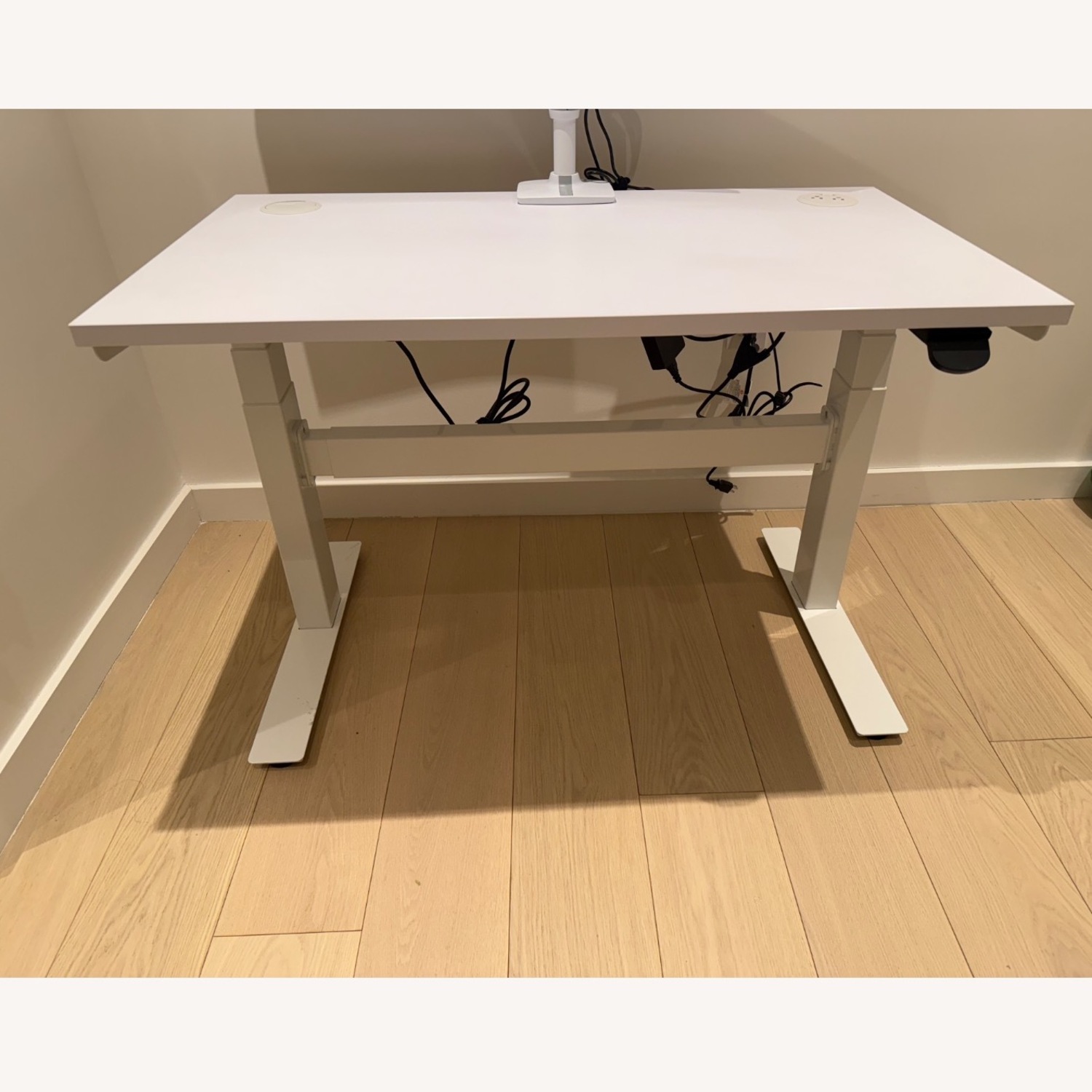 Seller's Notes:Great standing desk for small offices. Has very strong stable base and white laminate top. Desk height ranges from 22.6” high to 50”. Desktop includes two outlets and a cord management slot.