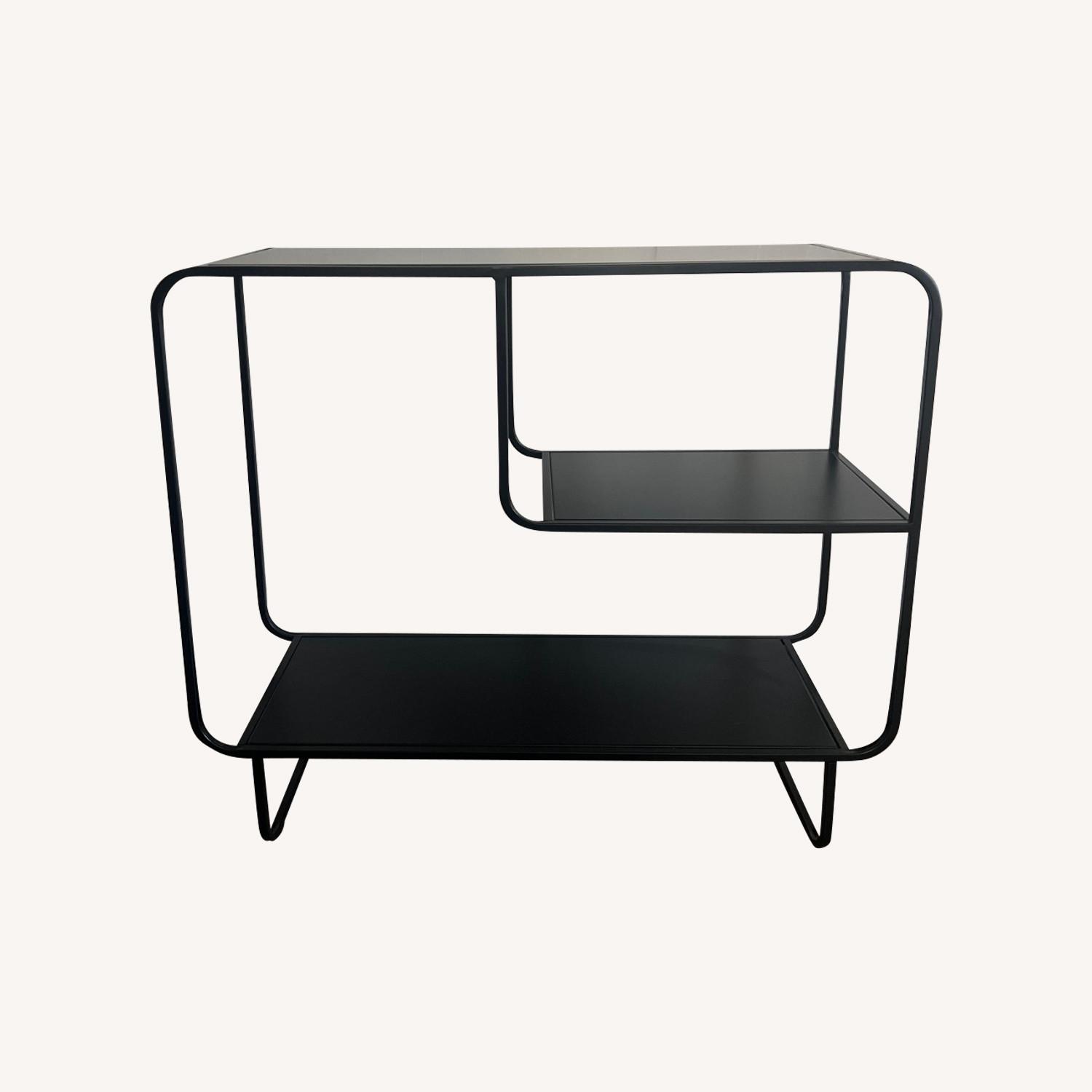 Seller's Notes:Powder-coated metal storage console with a modular look inspired by ‘60s décor. Featuring a main compartment and accented with a smaller storage cubby, showcasing curving edges to store books, trinkets and more, just the way you like.