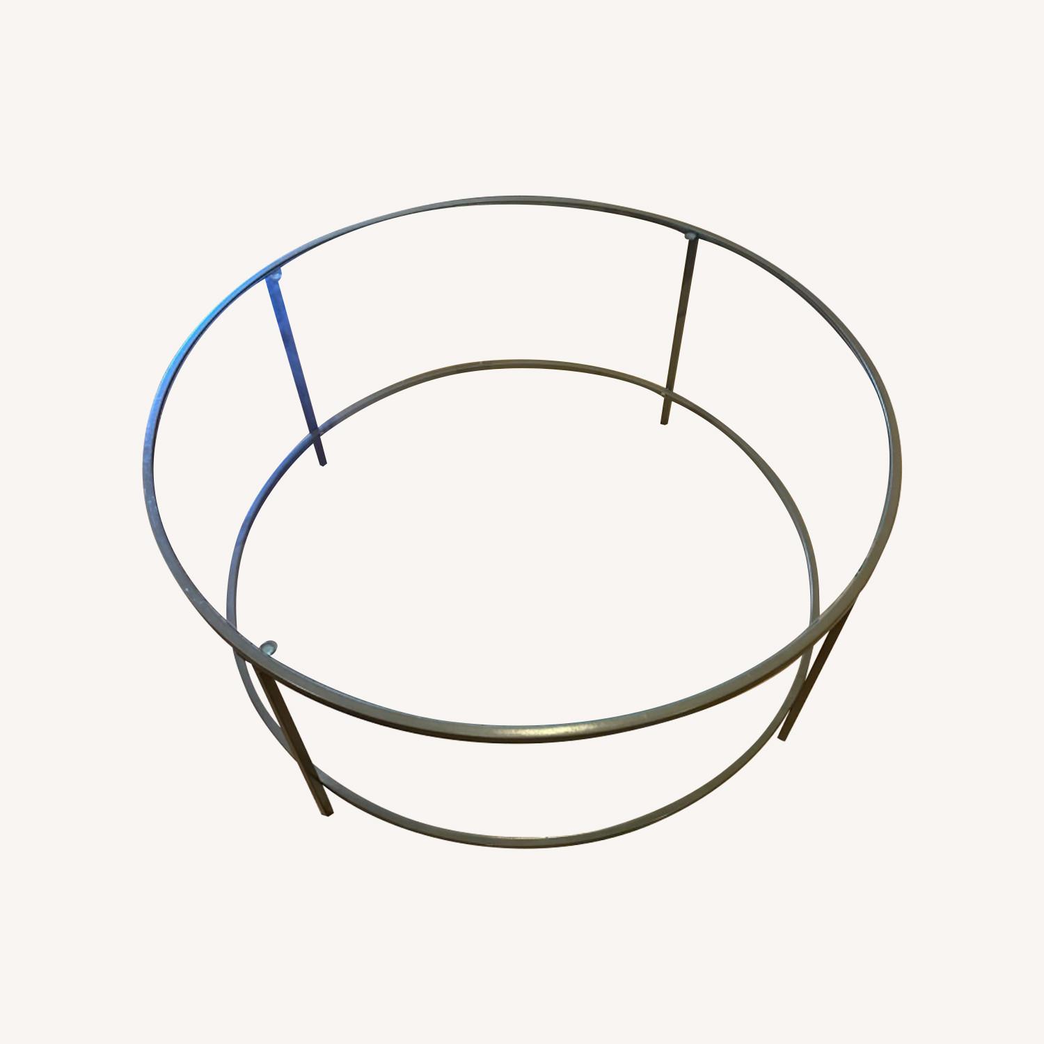 Seller's Notes:Light weight, elegant metal coffee table, cut in the round with a base ring and four legs, complete with a glass-paned tabletop. - Metal, glass - Wipe clean - Dimensions: 35.98"dia x 16.5"h - Clearance: 4"h - Weight: 30.8 lbs