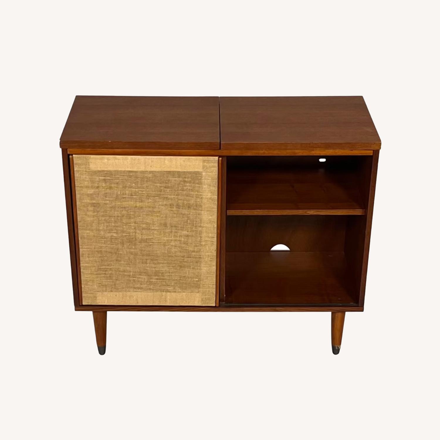 Seller's Notes:Great console for turntable and record storage. Vintage-inspired media unit constructed in a mid-century modern design. Sliding board allows you to hide your stuff or put it out on display. 2 adjustable shelves - 1 with wire dividers for easy vinyl LP storage. Hinged top lifts up to reveal a space for your turntable with adjustable height settings so yours will fit. Wire management holes at the back for cords; slightly tapered legs with brass plating. My turntable is pretty big so I had it on the top of the table. There is some light wear and tear from normal usage. Sadly, I need to sell because it doesn’t fit for my new apartment