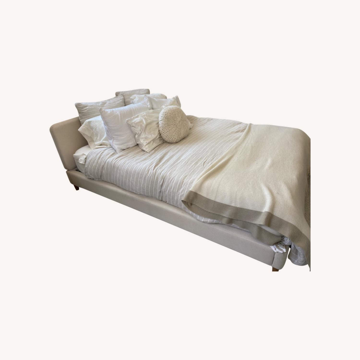 Seller's Notes:Bring clean, cozy lines to your space with this linen upholstered platform bed frame. Featuring a sleek upholstered headboard and frame with pine wood legs and slatted base. Available exclusively at Urban Outfitters.