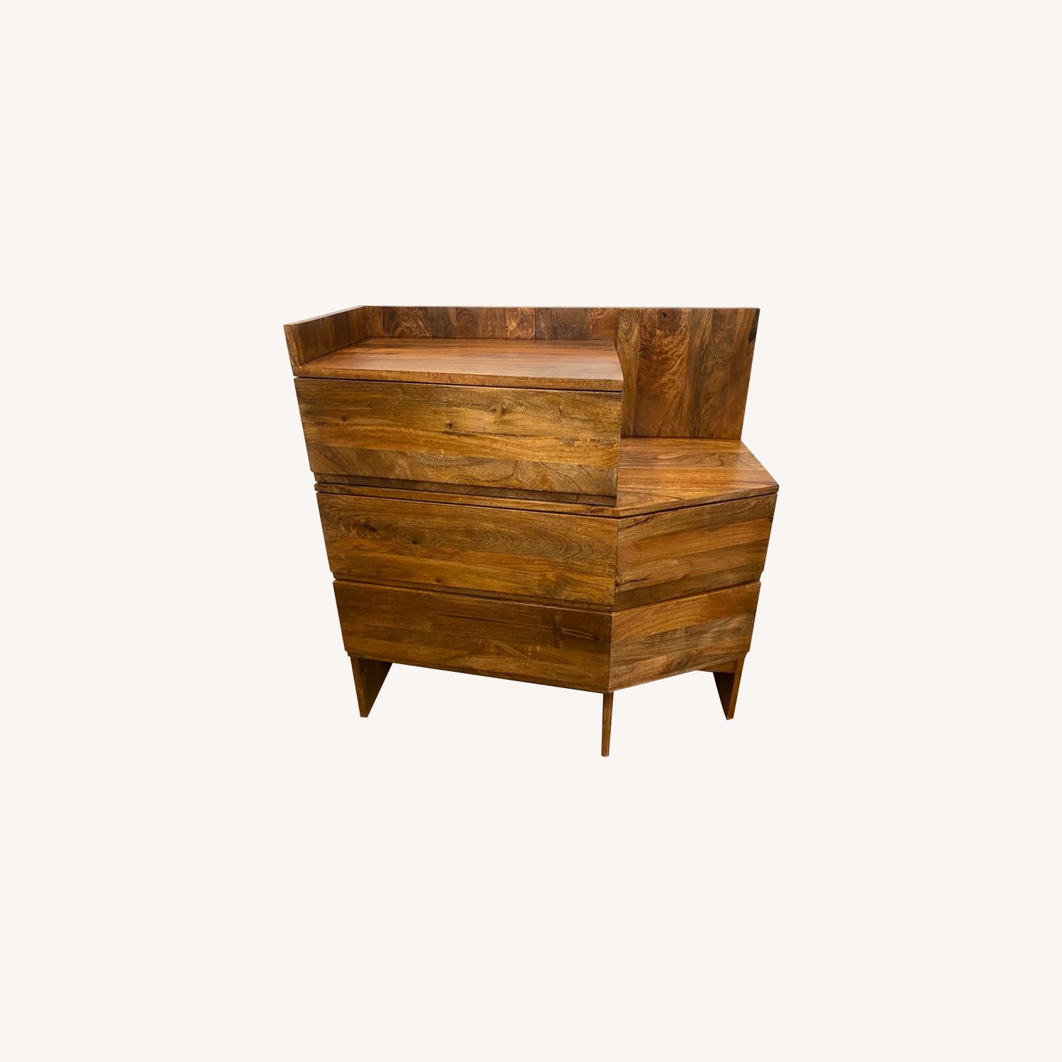 Seller's Notes:Wood dresser in excellent condition with three drawers and a staggered height top. One blemish (5" diameter, see photo) from leaving a potted plant on top, but no scratches or other discoloration, and structurally still 100%. Just moved and a built-in dresser makes more sense for the new apartment, so sadly letting this one go. Live out your 70s boho dreams or just store lots of socks, the choice is yours...