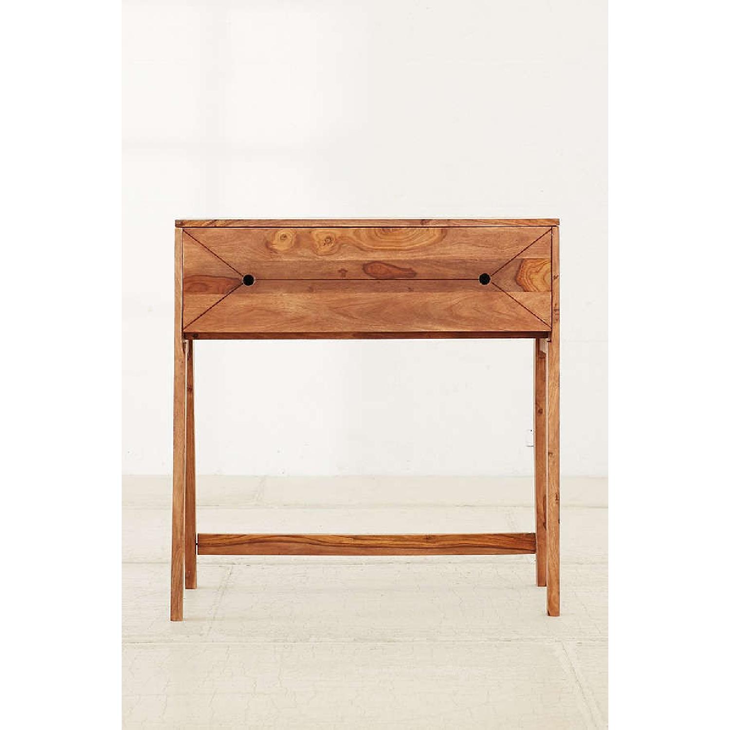 Seller's Notes:Essential fold-out desk to optimize storage + work space in any apartment or small living area. Solid + durable design that folds out when you need it + tucks away when you don't. Features secret storage compartments that lift to reveal plenty of room for pencils, paper + more. Modern + rustic touch to any living space. Content + Care - Wood - Wipe clean - Imported Size - Folded up: 13"l x 35"w x 35"h - Folded out: 20"l x 35" x 35''h
