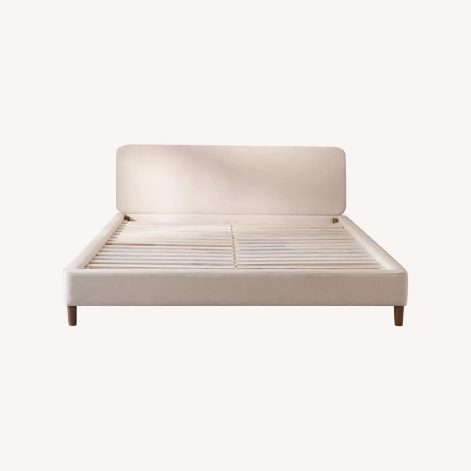 Seller's Notes:Beautiful queen size bed with upholstered headboard and pine wood legs. Curved headboard and chair tapered wooden legs. Slatted base - no box spring required.