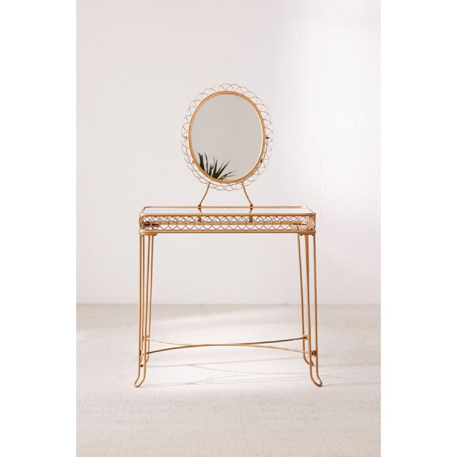 Seller's Notes:GOLD metal vanity in a playful looped-wire design complete with a glass tabletop and attached mirror. Some scratches / signs of wear throughout, but it looks more like it was designed that way, given the overall look of the piece beng antique-ish.