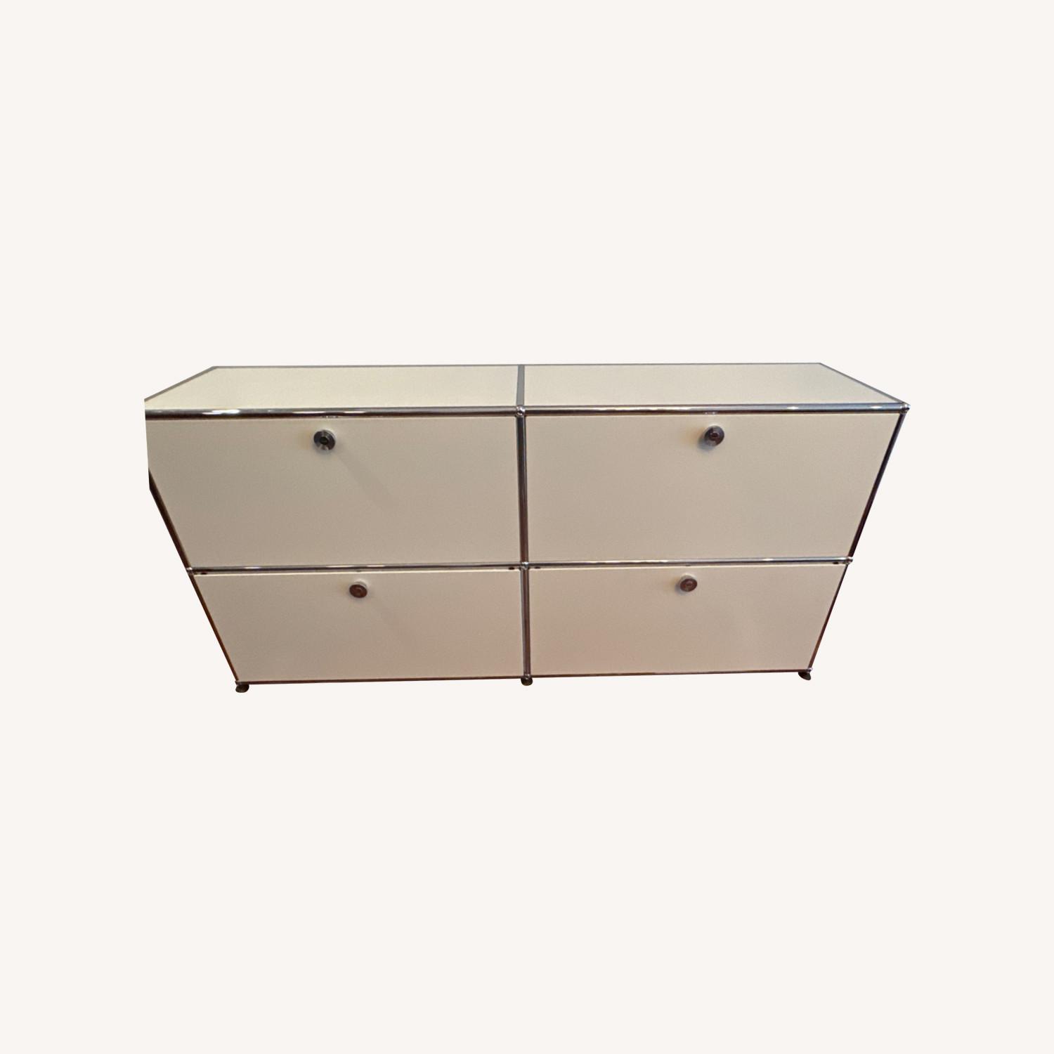 Seller's Notes:USM Haller Credenza. White, 4 drawers, 2 pull-down, two filing. Some small faint scratches on surface. Inside drawers some staining as in photo.