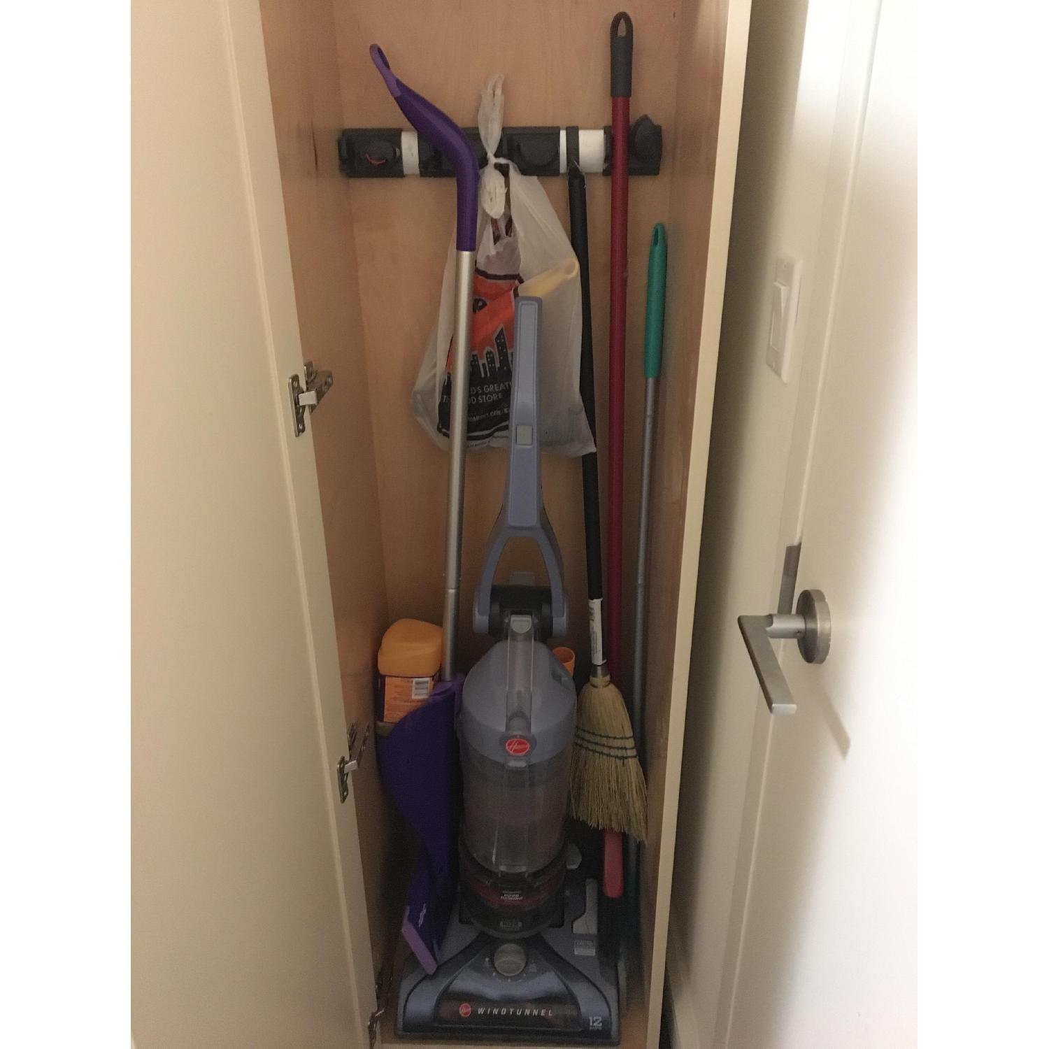 Seller's Notes:This is a two piece custom made utility closet. The top piece adds 27.5 inches and is easily screwed to the bottom. Will sell both or bottom only. The bottom has a unit built in to hold mops and rooms and has hooks. Painted in "frappe" by Benjamin Moore. Has minor scratches and a few tiny holes on right side from where it was screwed into wall. Will stand without being attached.