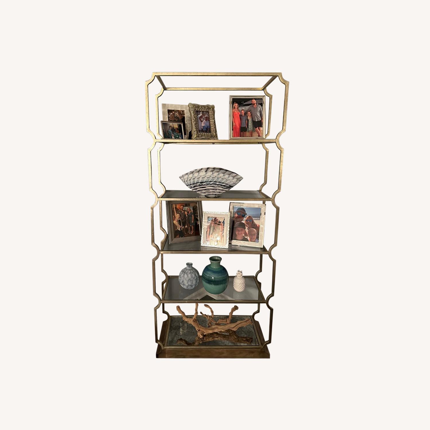 Seller's Notes:The Link to uttermost that is listed shows a silver bookshelf. This one for sale is more of a light gold tone with glass & antique mirrored shelves.