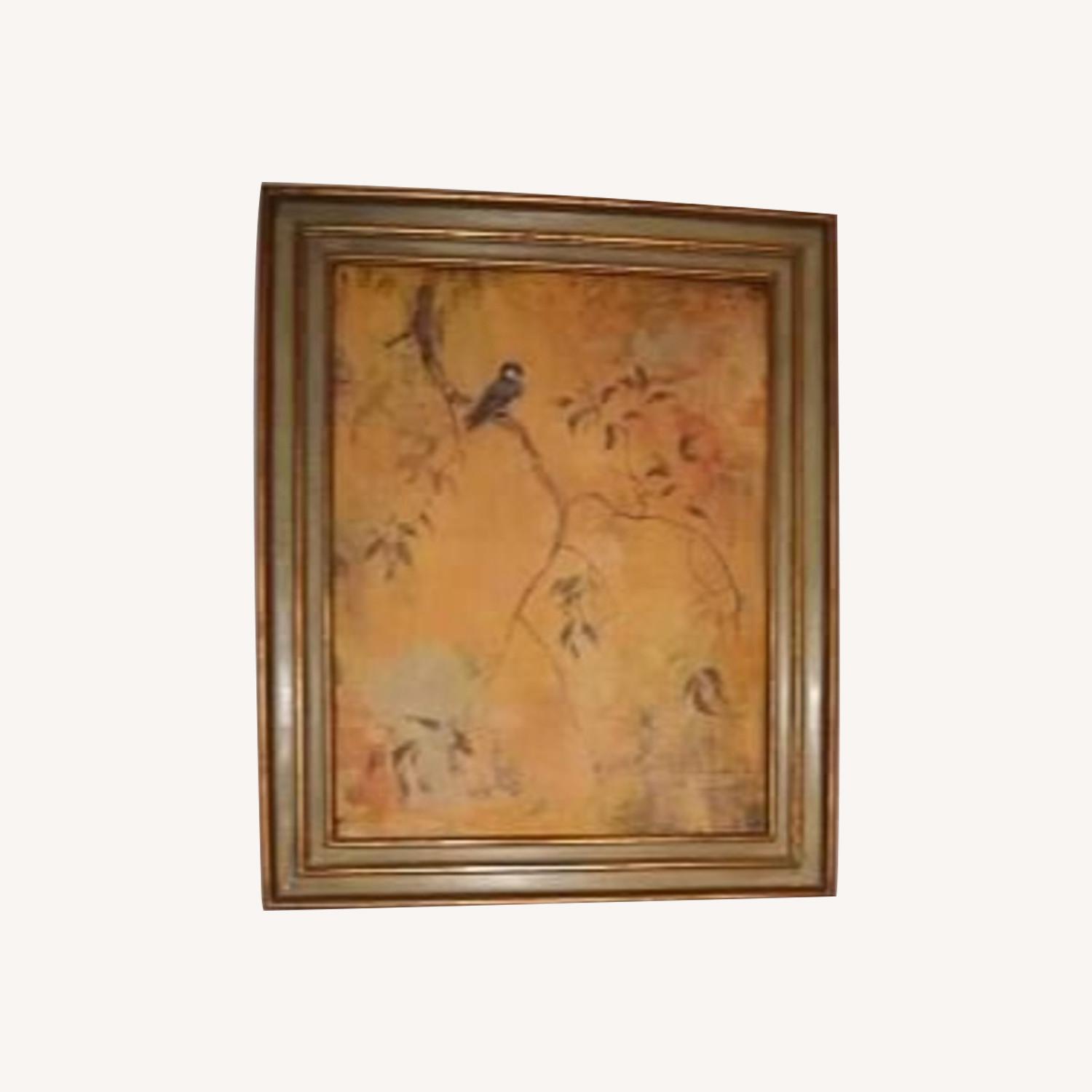 Seller's Notes:Uttermost, Gray Blue Swallow Featuring Bird on a Branch Framed Art Print. Part of the Grace Feyock Collection, serene, peaceful, large piece for your dining room, living room, bedroom or entry way. Soft green, grey and tan colors. Frame trimmed in gold leaf. In good condition, with exception of minor chip in bottom corner, which isn't really visible when hung.