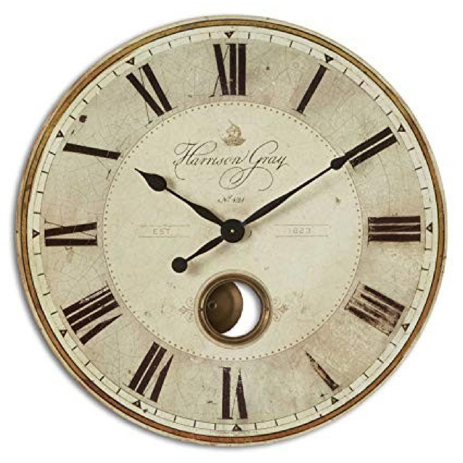 Seller's Notes:30 inch Harrison Grey Wall, beautiful, brand new condition. Decor item, the pendulum moves but the clock doesn't tell accurate time.