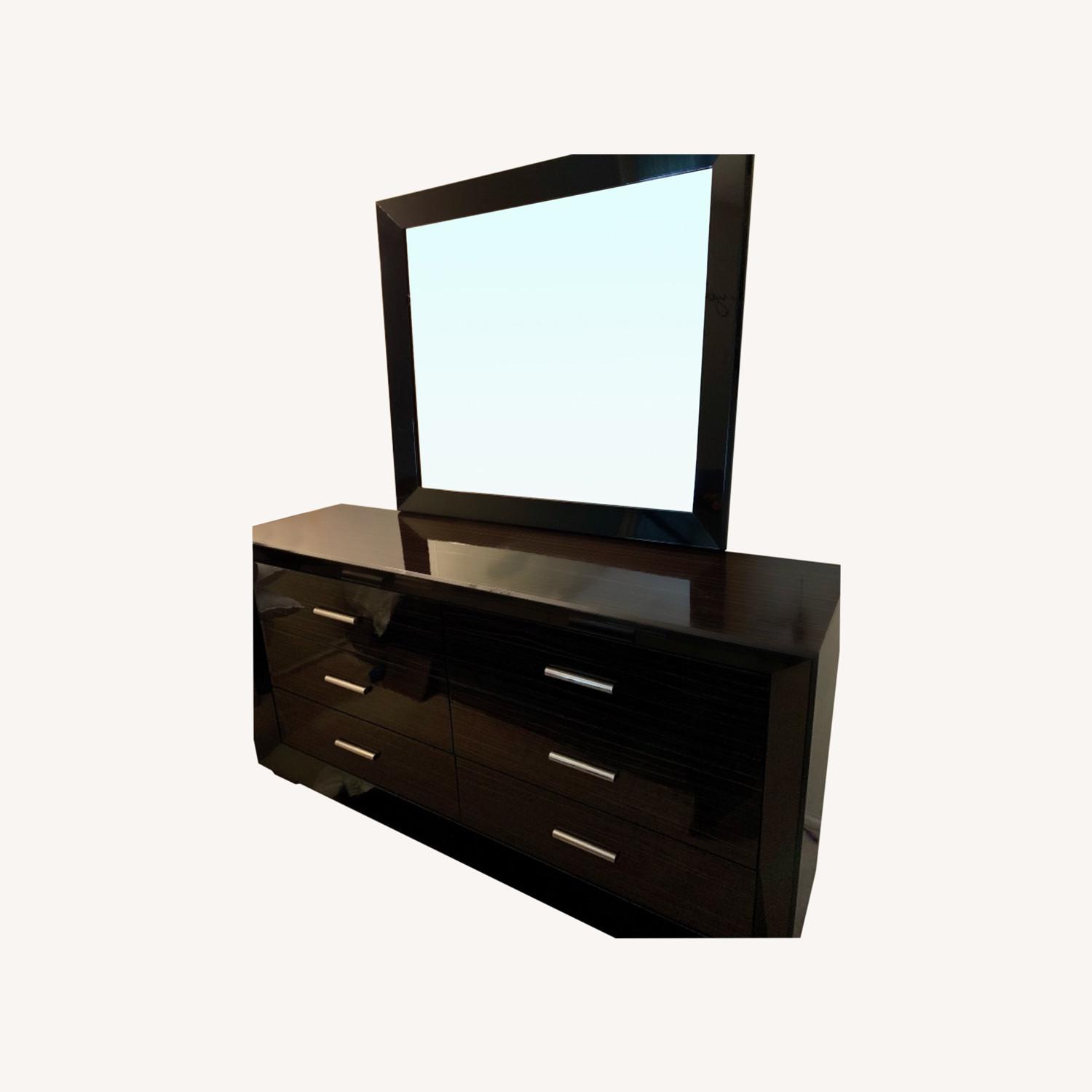 Seller's Notes:Dark wood and black trim dresser for sale! In like new condition! 6 drawers - mirror included Purchased 2 years ago It’s an espresso wood with black trim Dimensions: 68 inches long x 19.5 inches depth x 35 inches height and then the mirror that attaches to the dresser is 38 inches tall