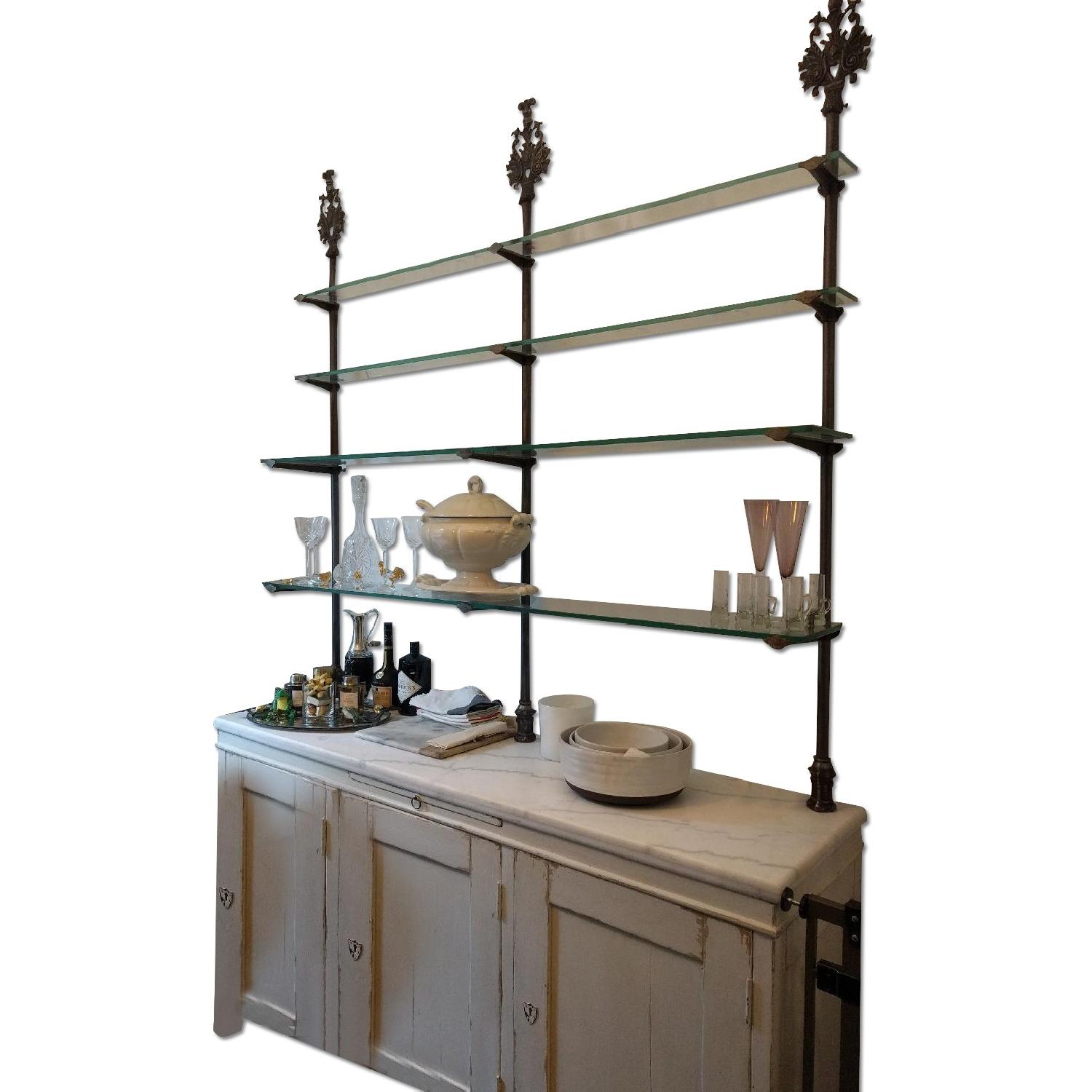 Seller's Notes:This is a three year old buffet, by Van Thiel. It has a country finish vintage paint job, thick slab of carrara marble for counter top, and three ornate cast iron columns with adjustable glass shelving. There is an ton of storage space in the cabinets below; and the heavy iron and glass shelves can support a lot more. We love this piece, but are redecorating.