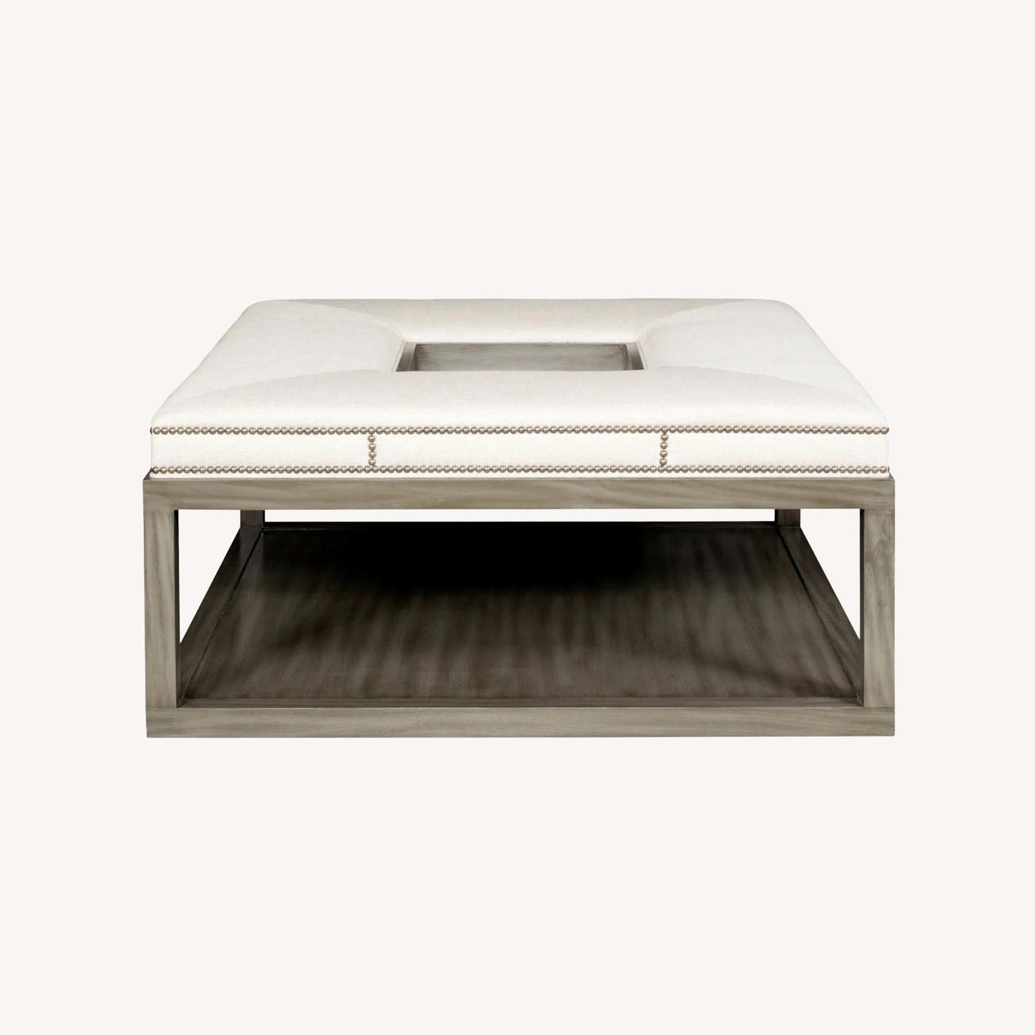 Use this square ottoman as a fresh and sophisticated replacement for a traditional coffee table. The wood base provides a base shelf for storage, while the top features a center square for containing smaller items. Customize the piece by choosing from hundreds of fabric and leather options, as well as a wood finish and nailhead trim options.