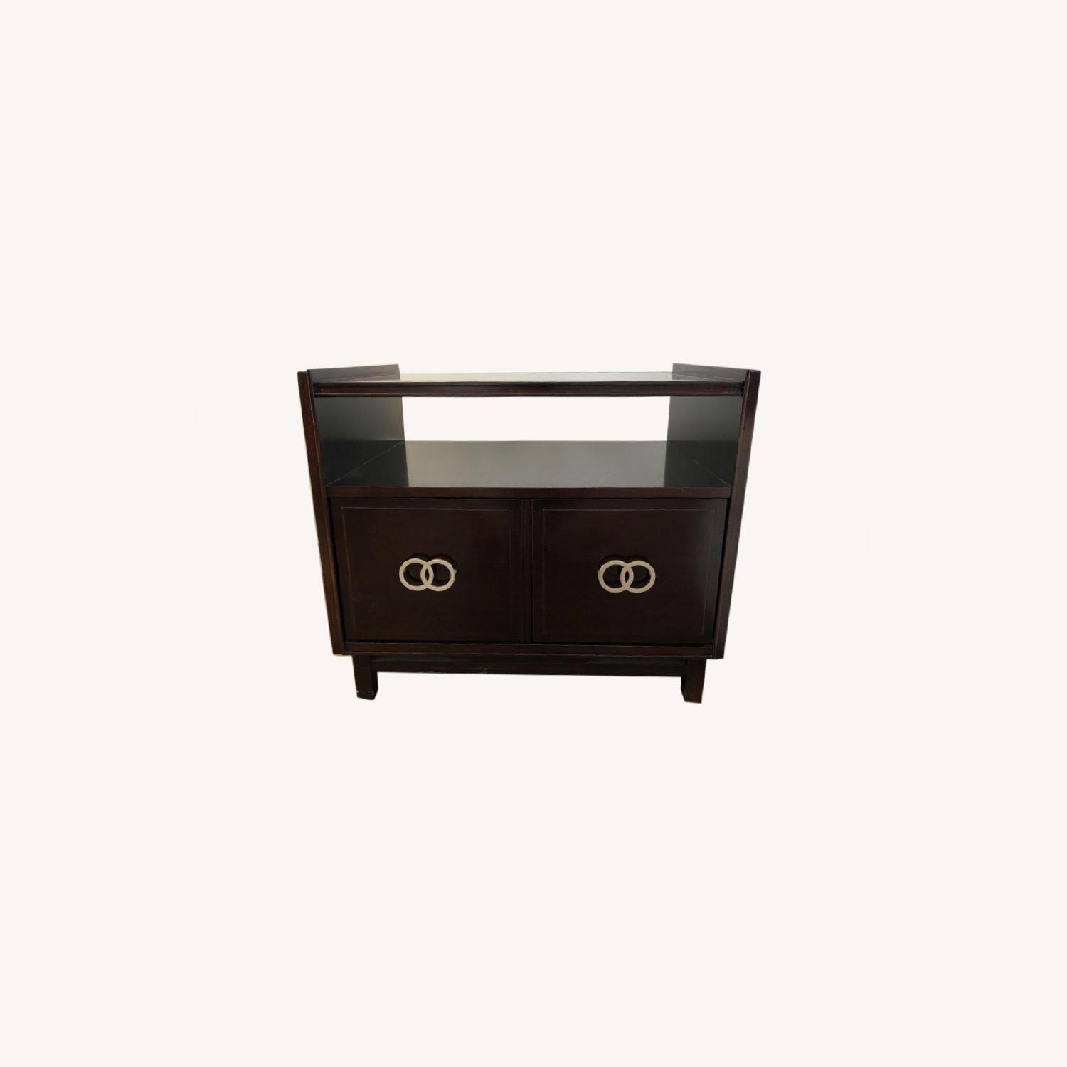 Seller's Notes:Vanguard nightstand with decorative silver door knobs. Glass top with wood shelf and cabinets with additional storage. Great condition with slight scratches on the feet.