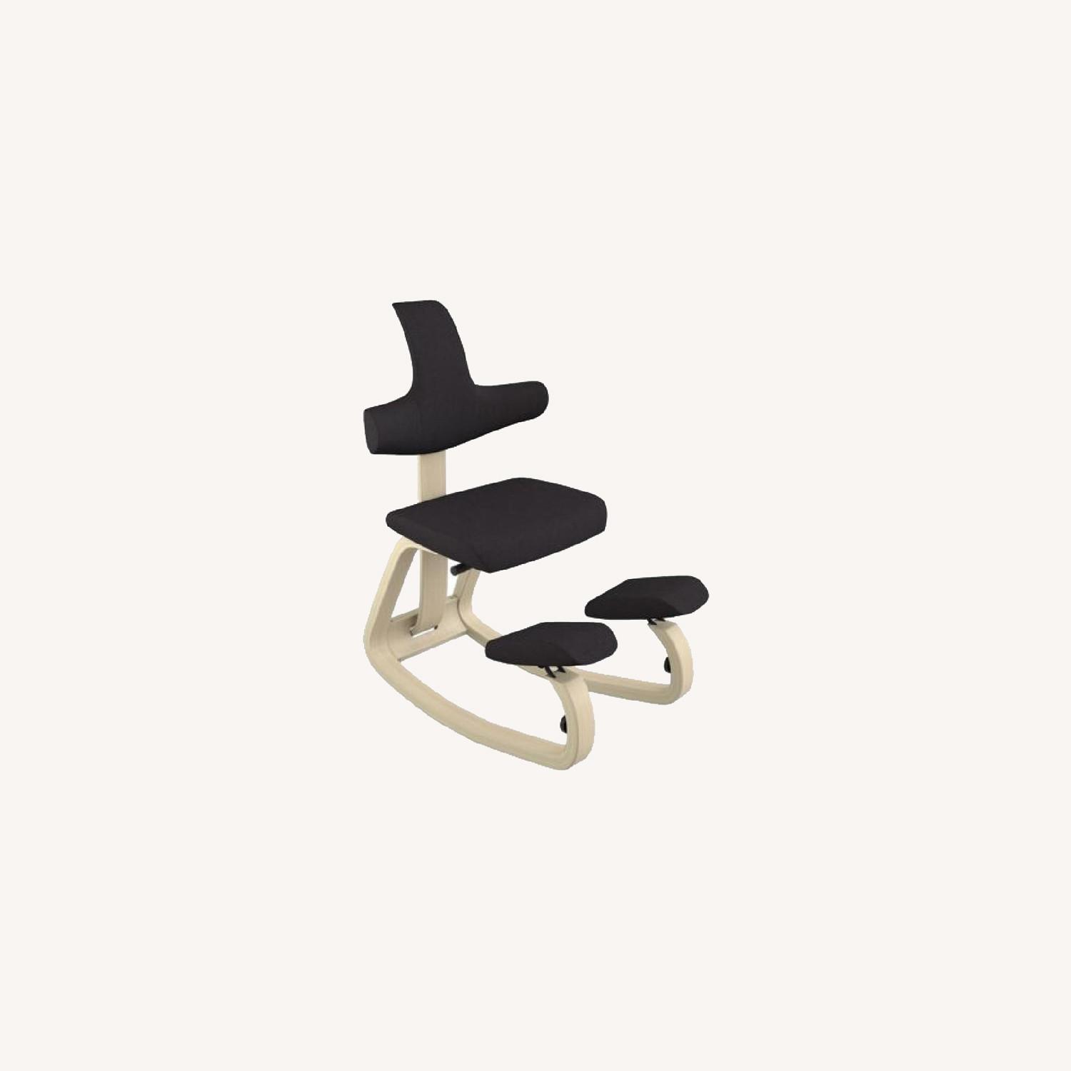 Seller's Notes:Beautiful design, mint condition (only 6 months old). Kneeling chair that eases back pain and pressure. Color: Black Revive fabric on Natural wood base. Great for artists, working from home and general leisure.