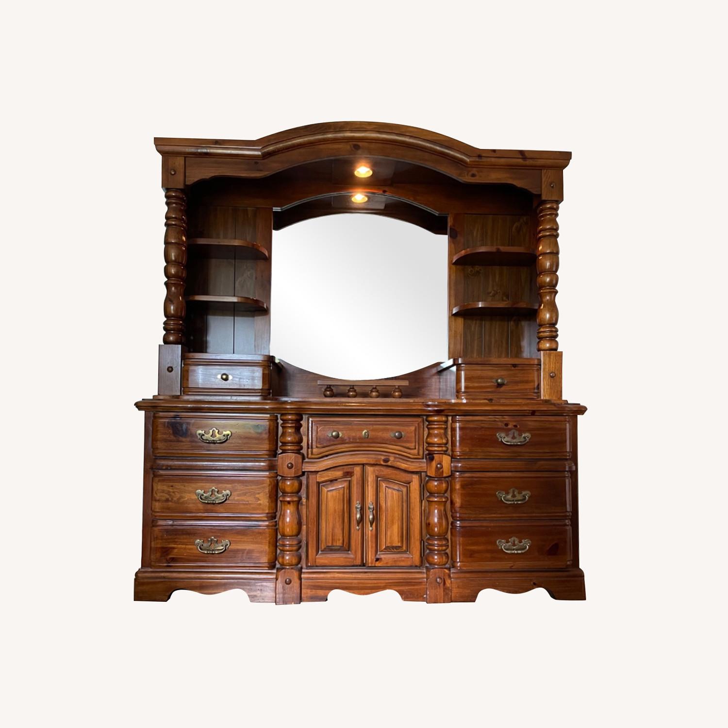 Seller's Notes:A beautiful wooden dresser topped with a grand mirror with shelves and light. This piece has plenty of storage and is perfect for a bedroom or dining room. It was purchased in the mid 90s and is still in great condition. The original owners are moving, and sadly cannot take this piece with them.