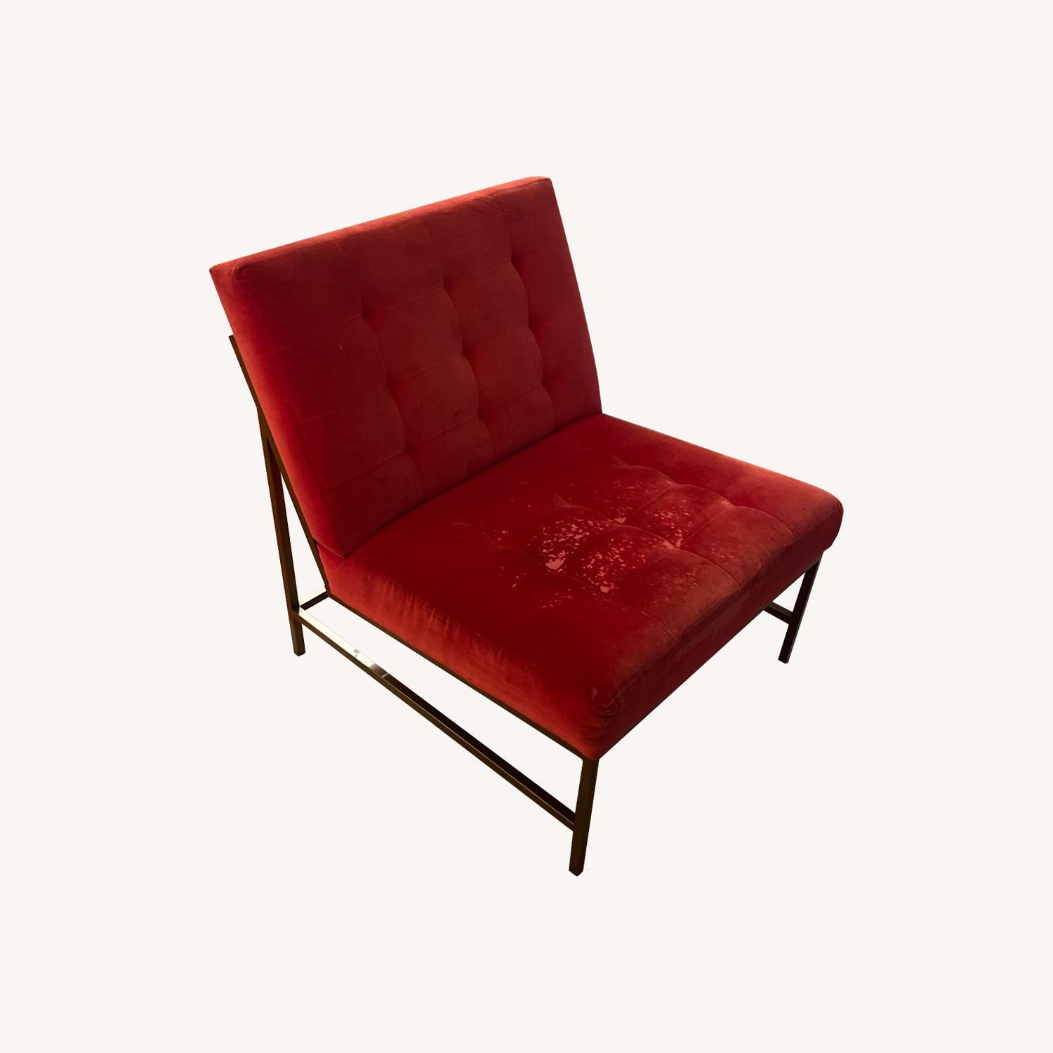 Seller's Notes:Well loved chair. The velvet is worn but the chair is still great and super comfortable. Would be great reupholstered or kept as is for being worn.