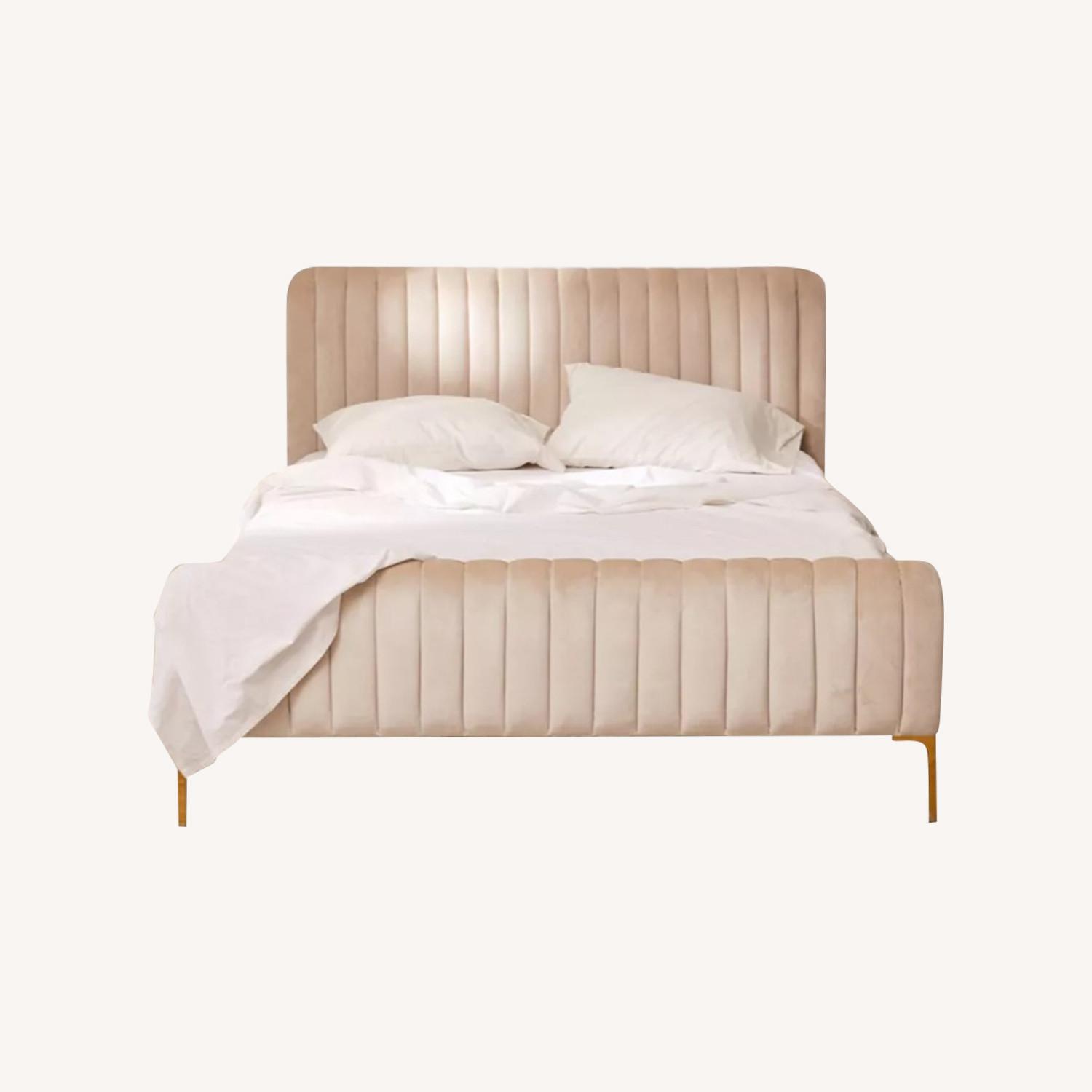 Seller's Notes:Tufted velvet bed is straight out of your Parisian dreams. Featuring a headboard and frame covered in soft, dimensional gray (but looks almost light pink or beige in person) velvet with tufted seaming and rounded edges. Finished with slim, shiny metal legs. Queen - Dimensions: 87.8"l x 65.35"w x 41.34"h - Mattress space dimensions: 79.9"l x 60.24"w - Leg height: 7.48", removable - Clearance: 4.33" - Weight: 104 lbs