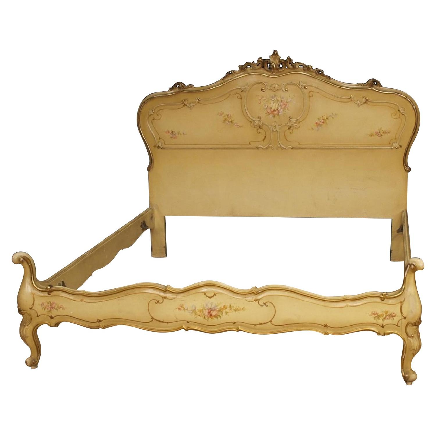 Seller's Notes:COD 6944 Venetian double bed from 20th century. Furniture in richly carved, lacquered, gilded and hand painted wood with floral decorations. Bed of great size and beautiful decoration that can accommodate an internal structure from the following maximum sizes: W 153 x D 200 cm. Furniture that shows small signs of wear and drops of color, overall in good state of conservation.