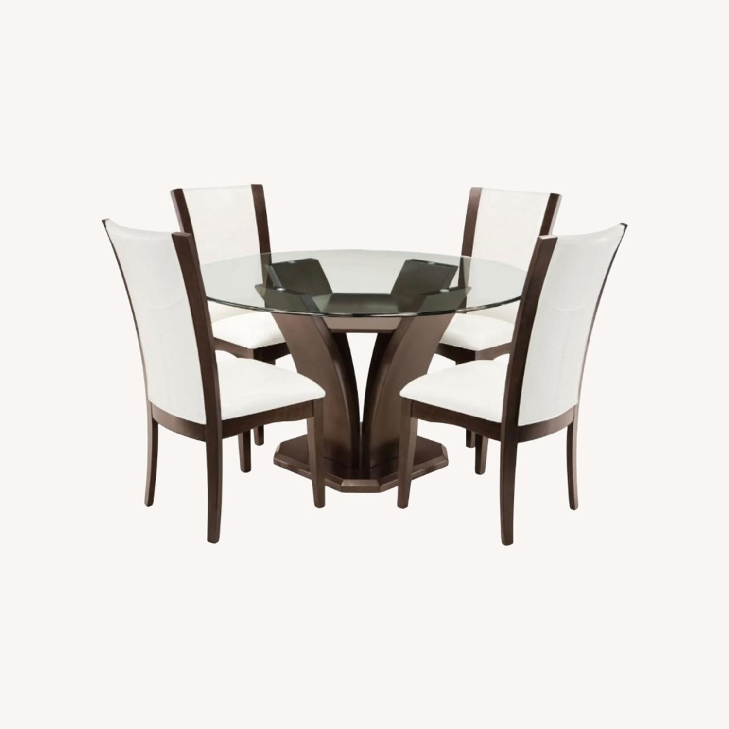 This Venice 5-pc. 48" glass dining set combines the small-scale coziness of casual dining with a more formal feel. The table features an elegant tulip base and a beveled glass tabletop that provides an open, airy feel. Plus, the easy-to-clean, faux leather chair seats provide a luxurious look.